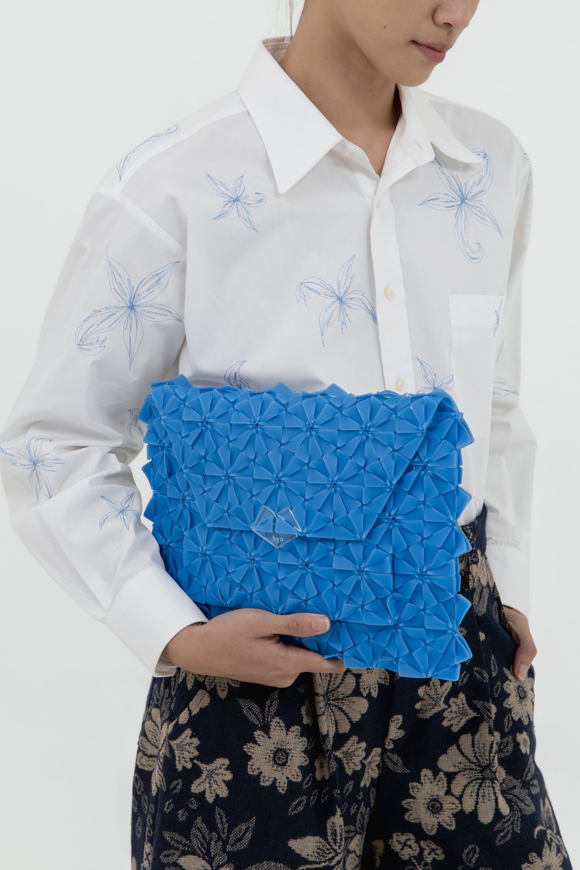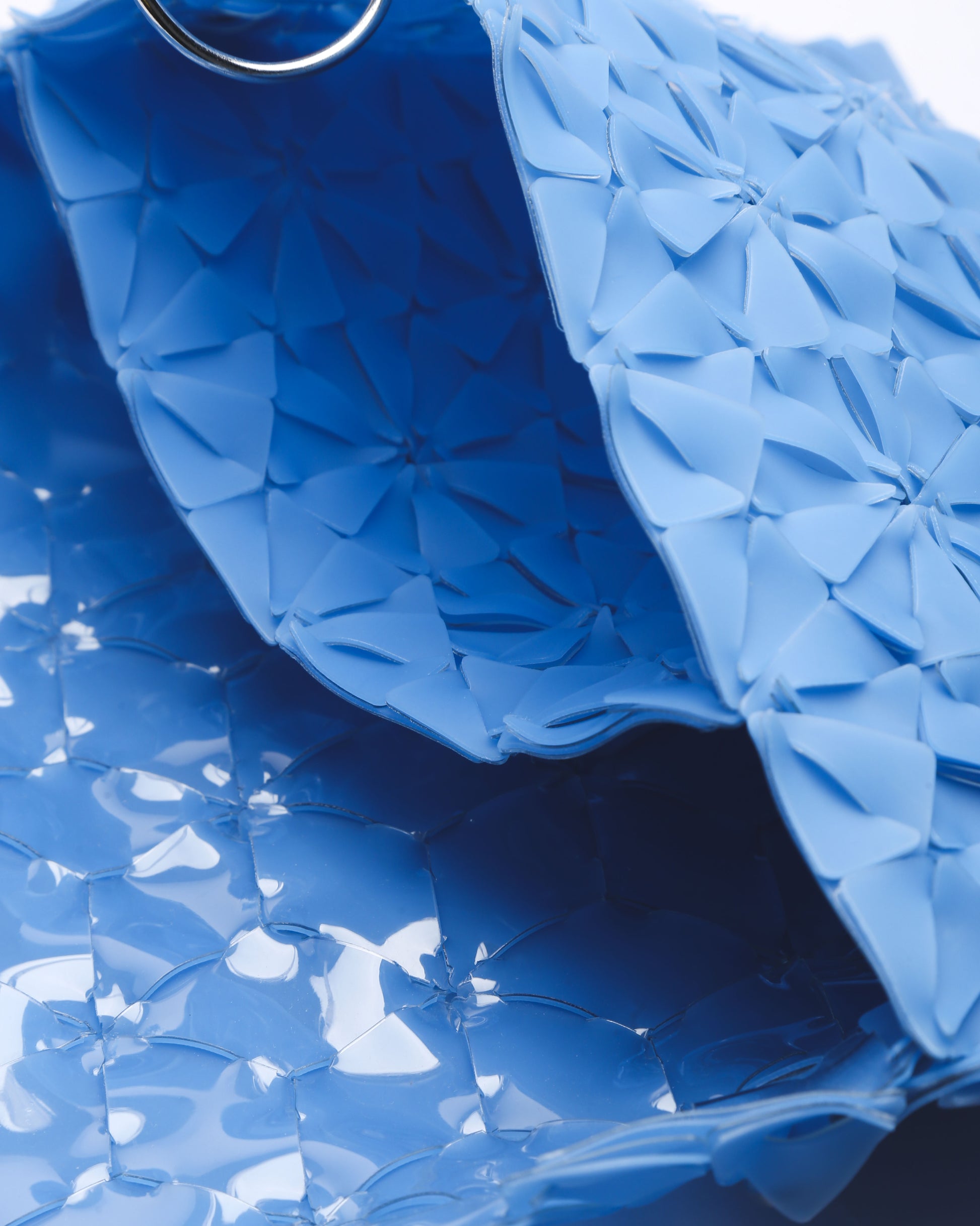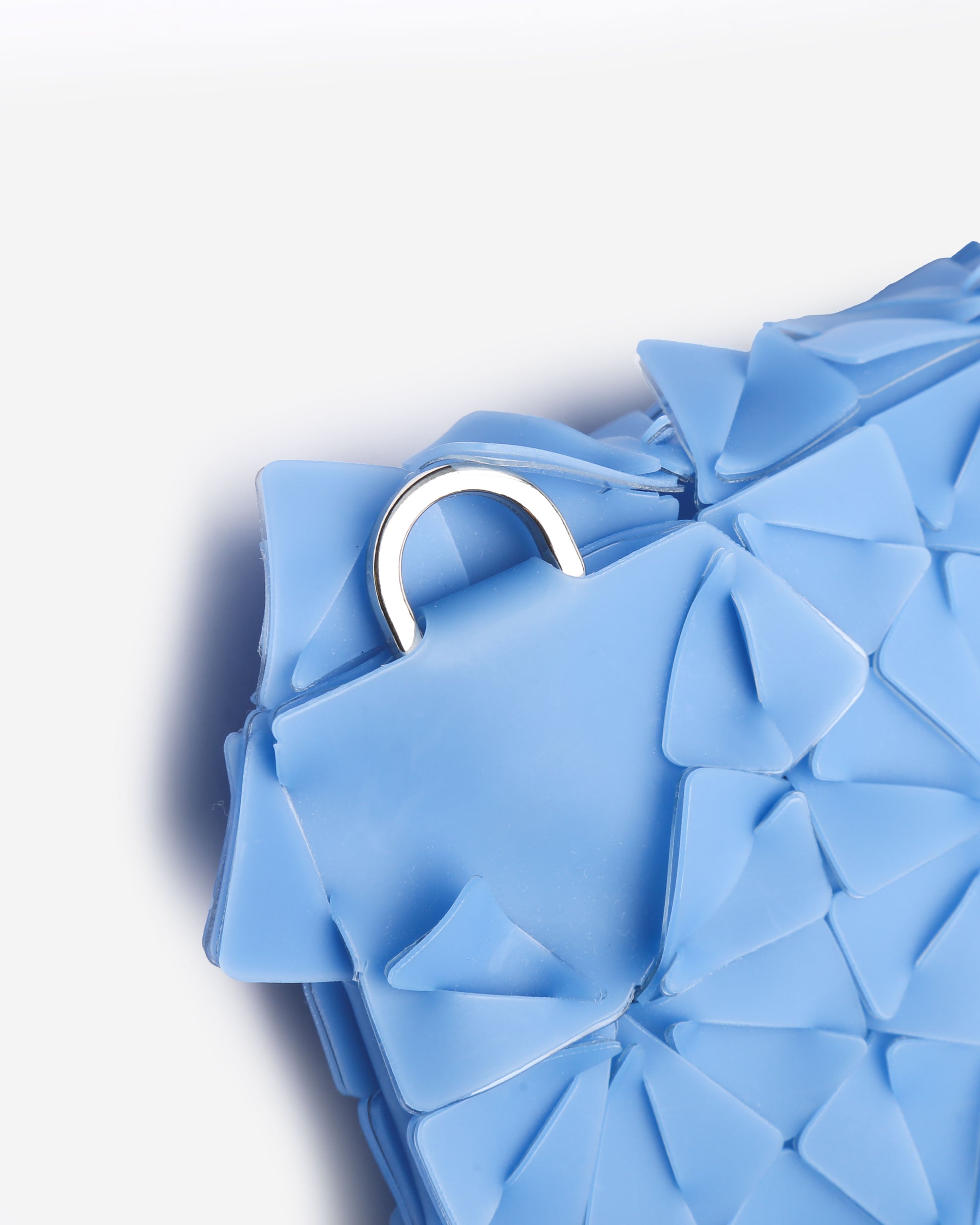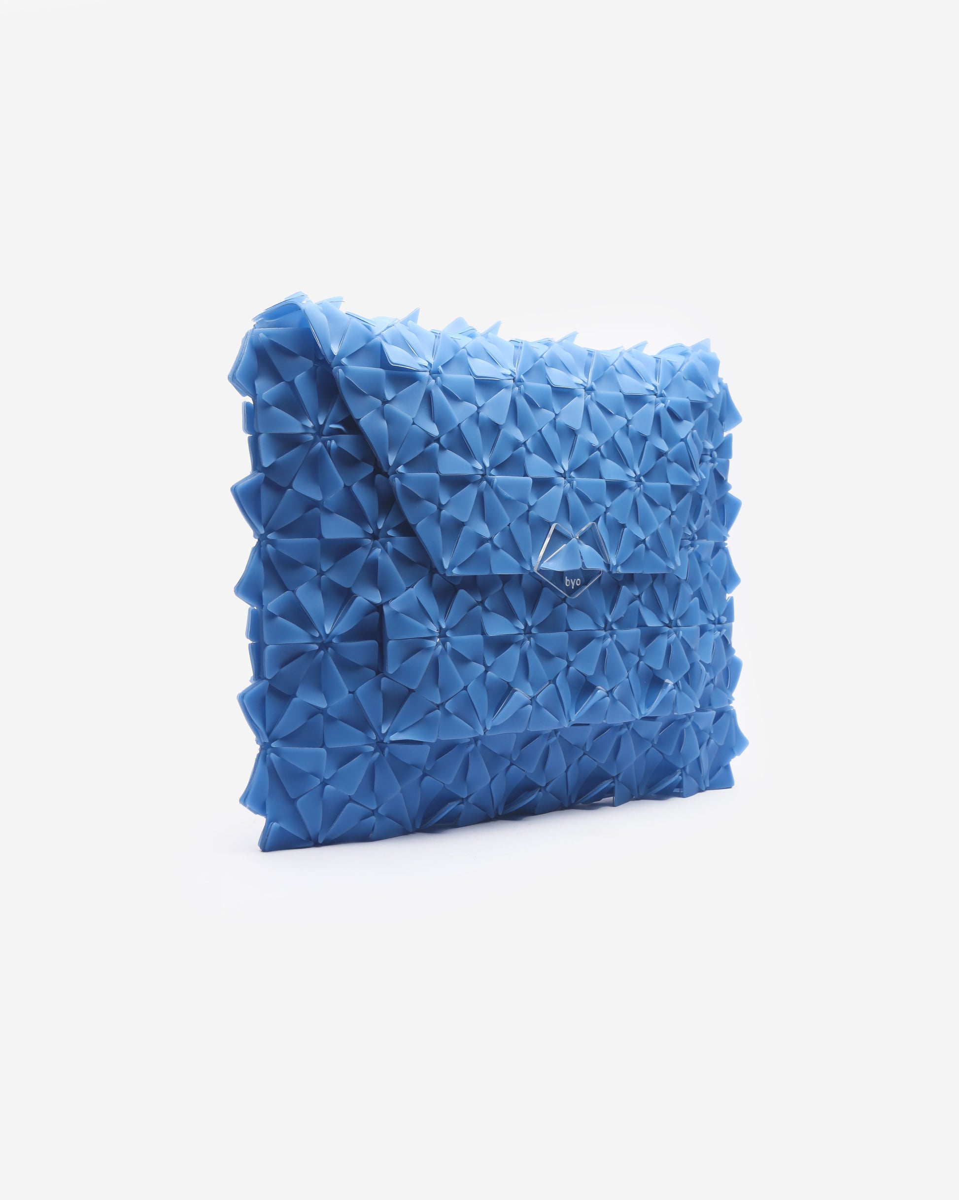 Handwoven Clutch, Geometric floral petal module design, Material 50% PVC and 50% Latex, D-ring for straps,Magnetic Flap, Laser Cut Acrylic Label