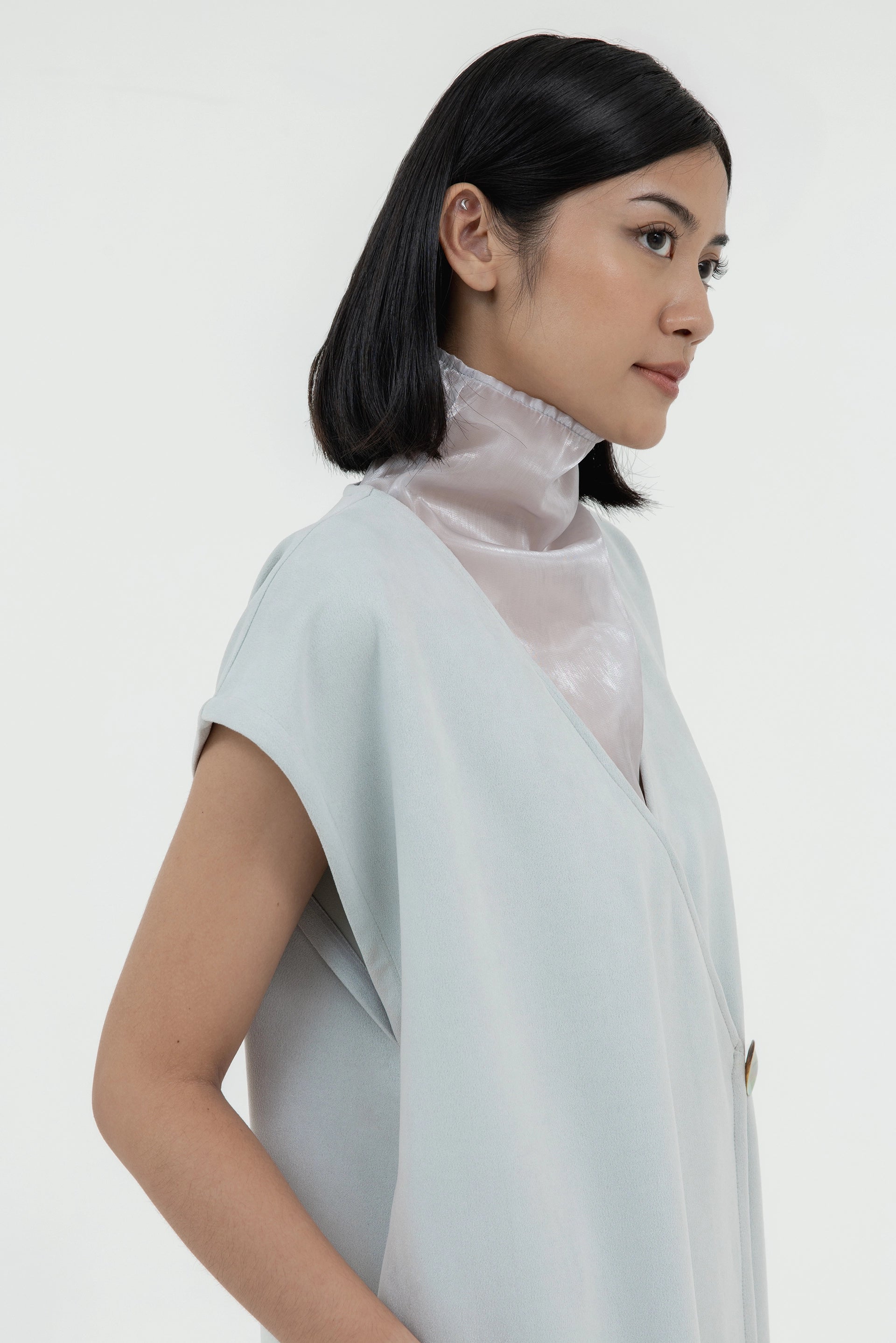 a sheer, sophisticated organza high-neck blouse paired with a luxurious suede oversized overlapped long vest, offering a perfect blend of elegance and modern edge