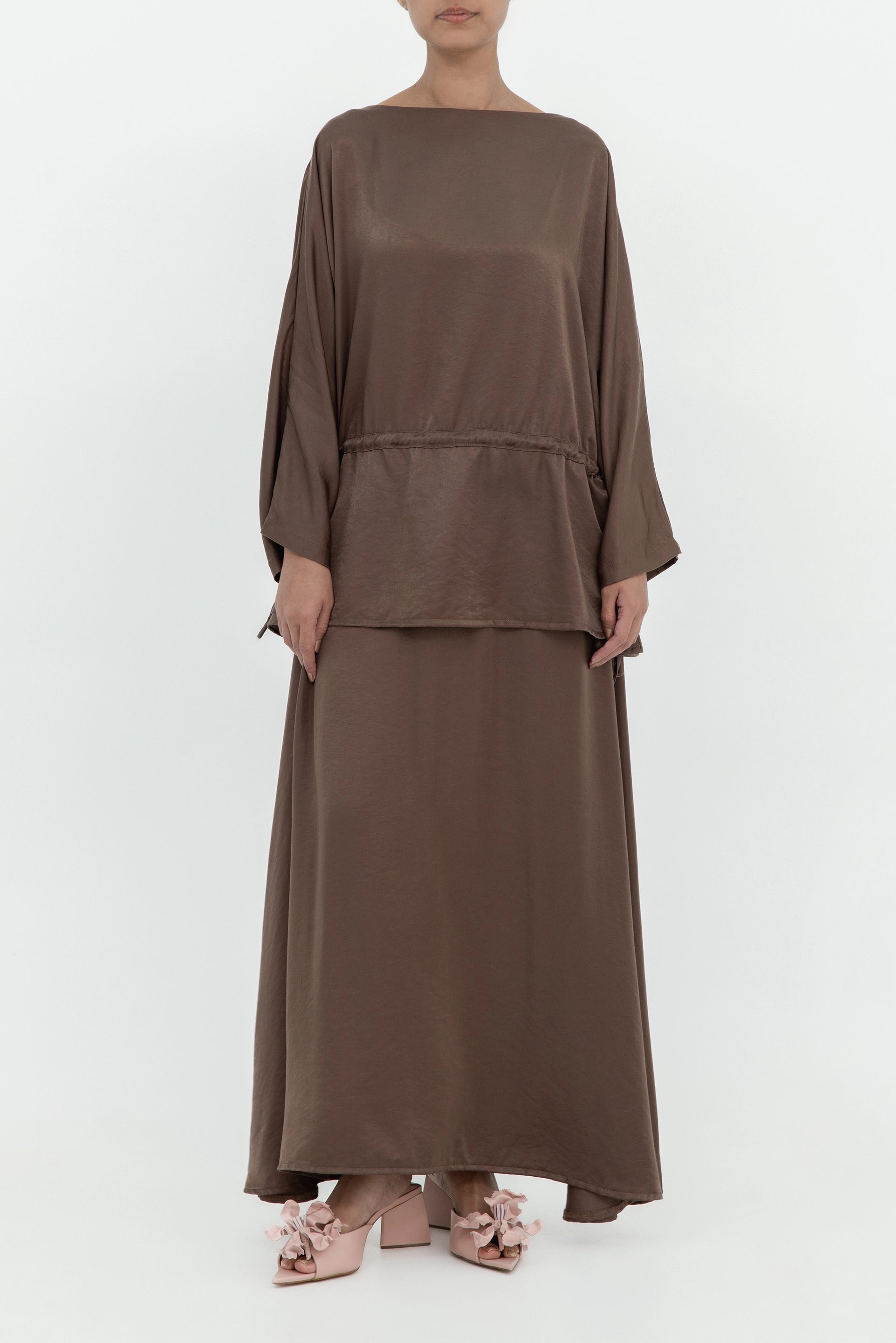 A relaxed-fit blouse cinched at the waist and a gathered flow long skirt, both crafted from lustrous rayon Tencel, showcase a subtle sheen and fluid drape for an effortlessly refined silhouette