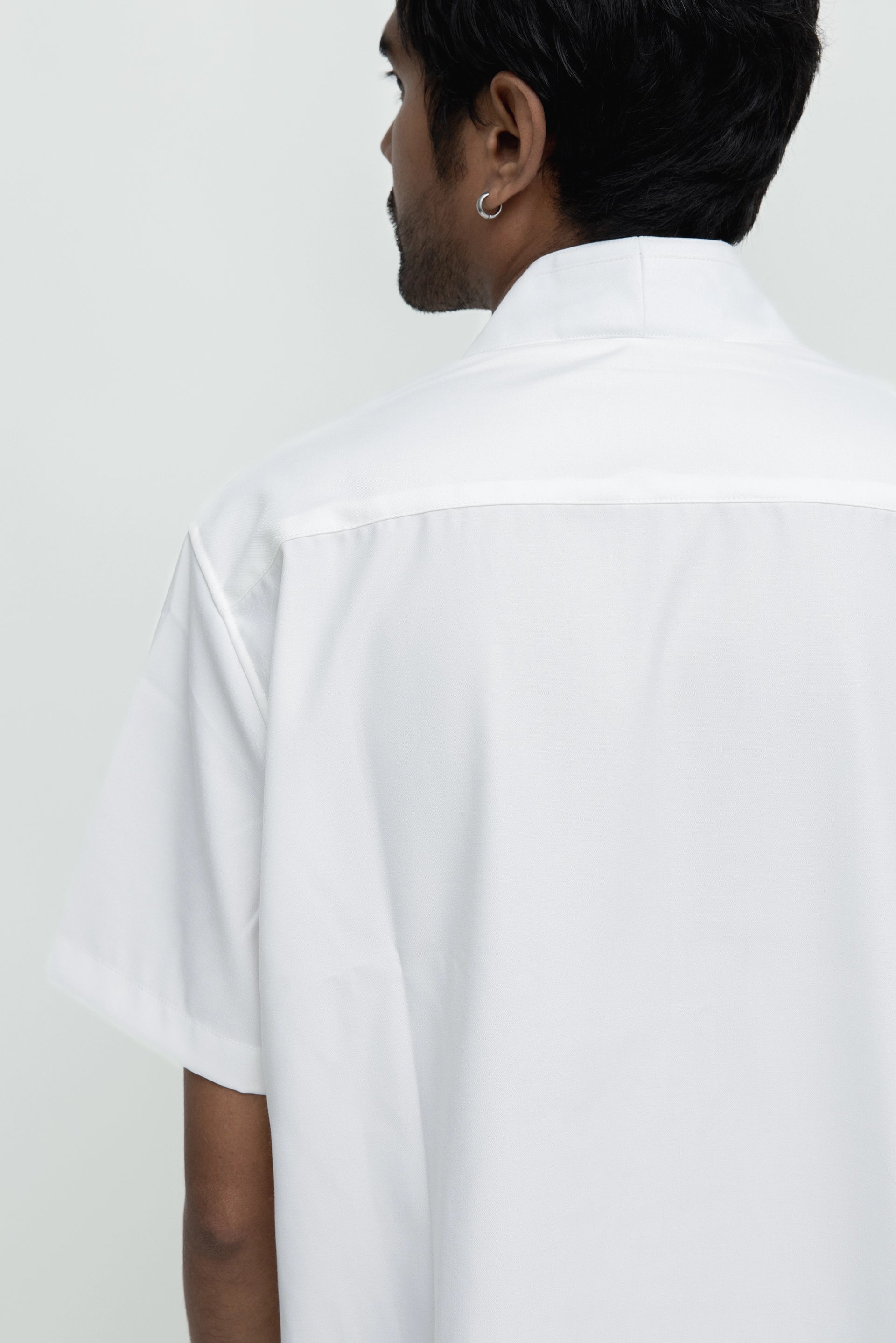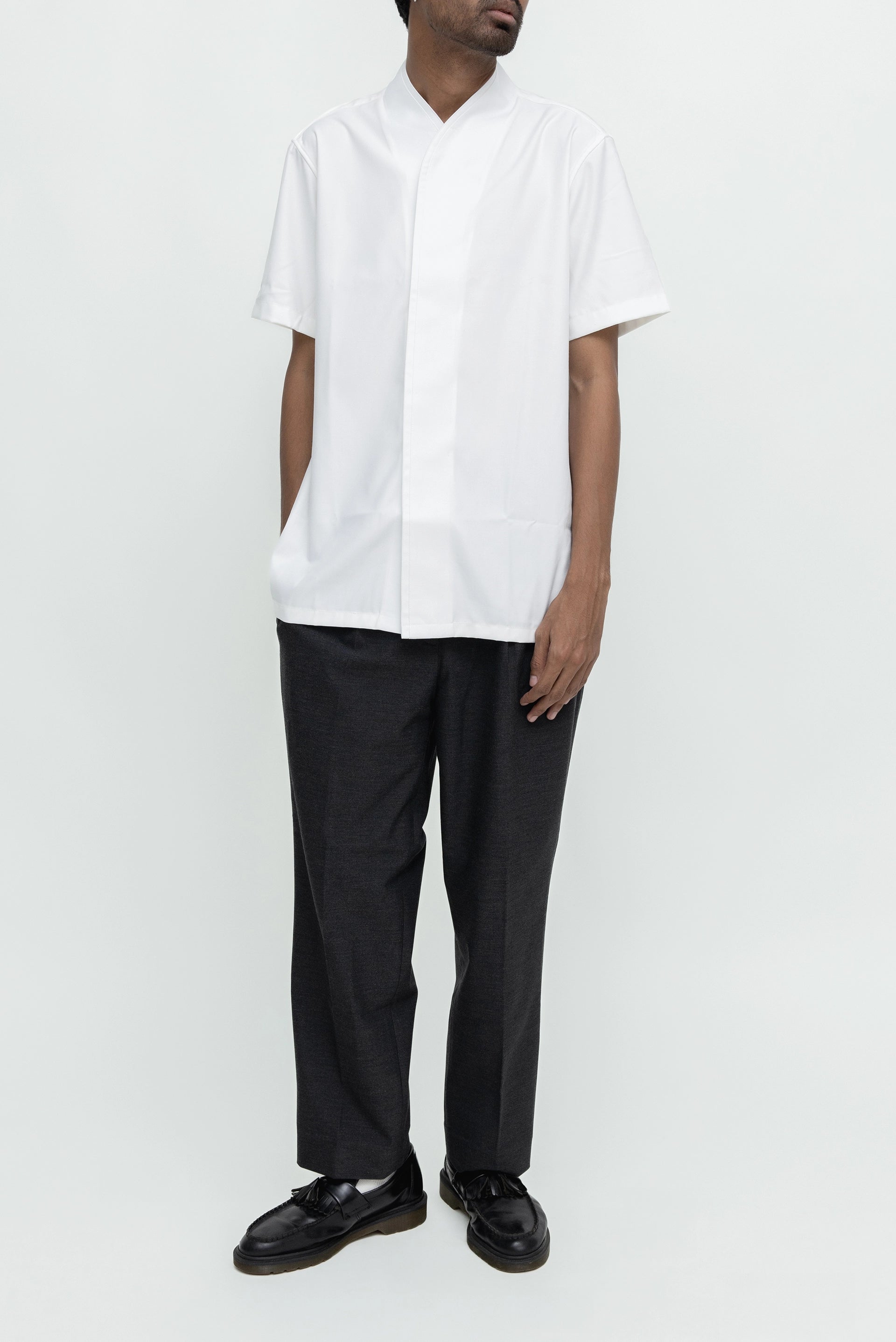 A collarless double-placket short-sleeve shirt featuring a clean, modern neckline. Designed with a regular fit and a concealed button placket, it offers a sleek, refined look with understated detailing—perfect for effortless, contemporary styling.