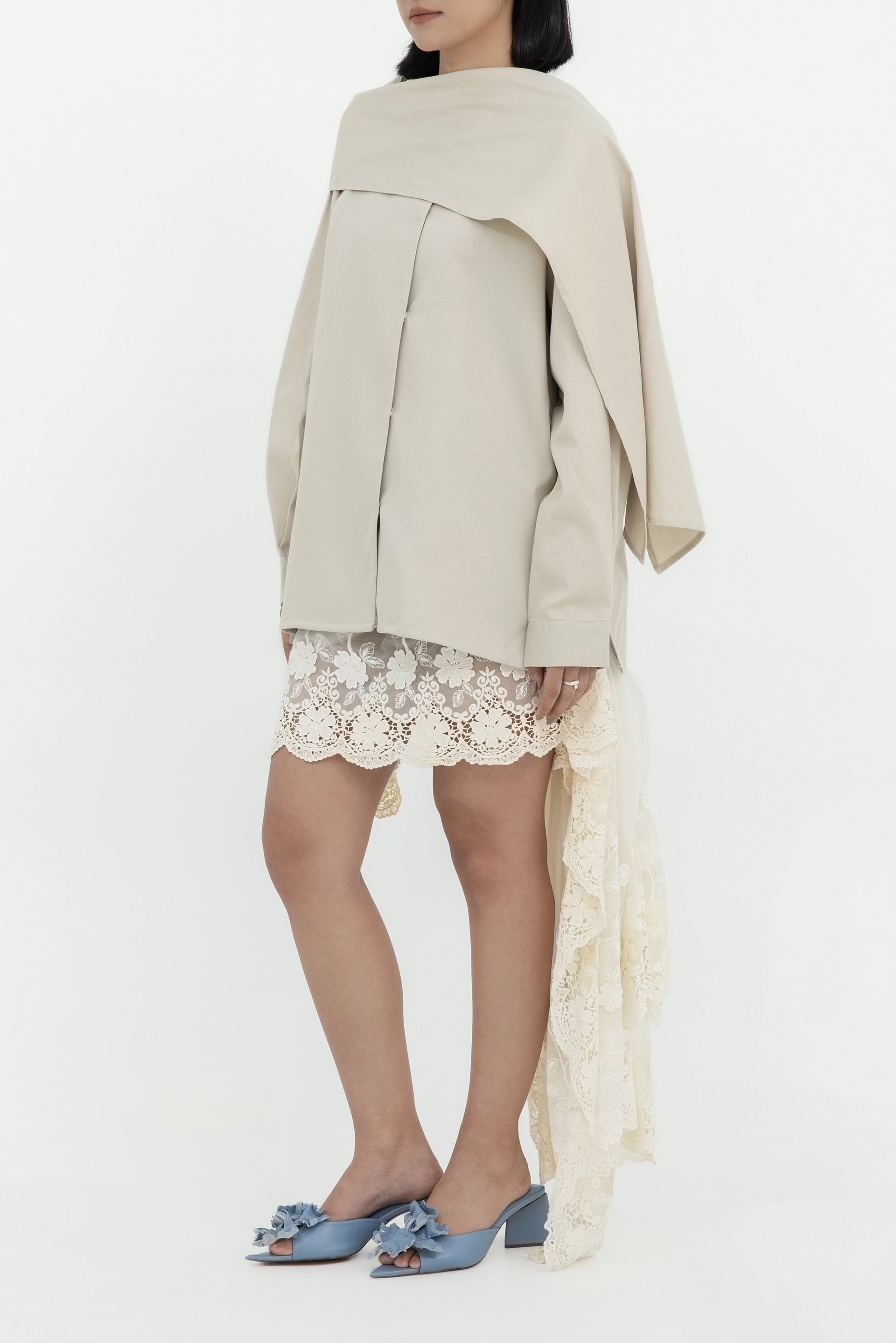 scarf-collar outer with hidden button opening, made from semi-wool polyester