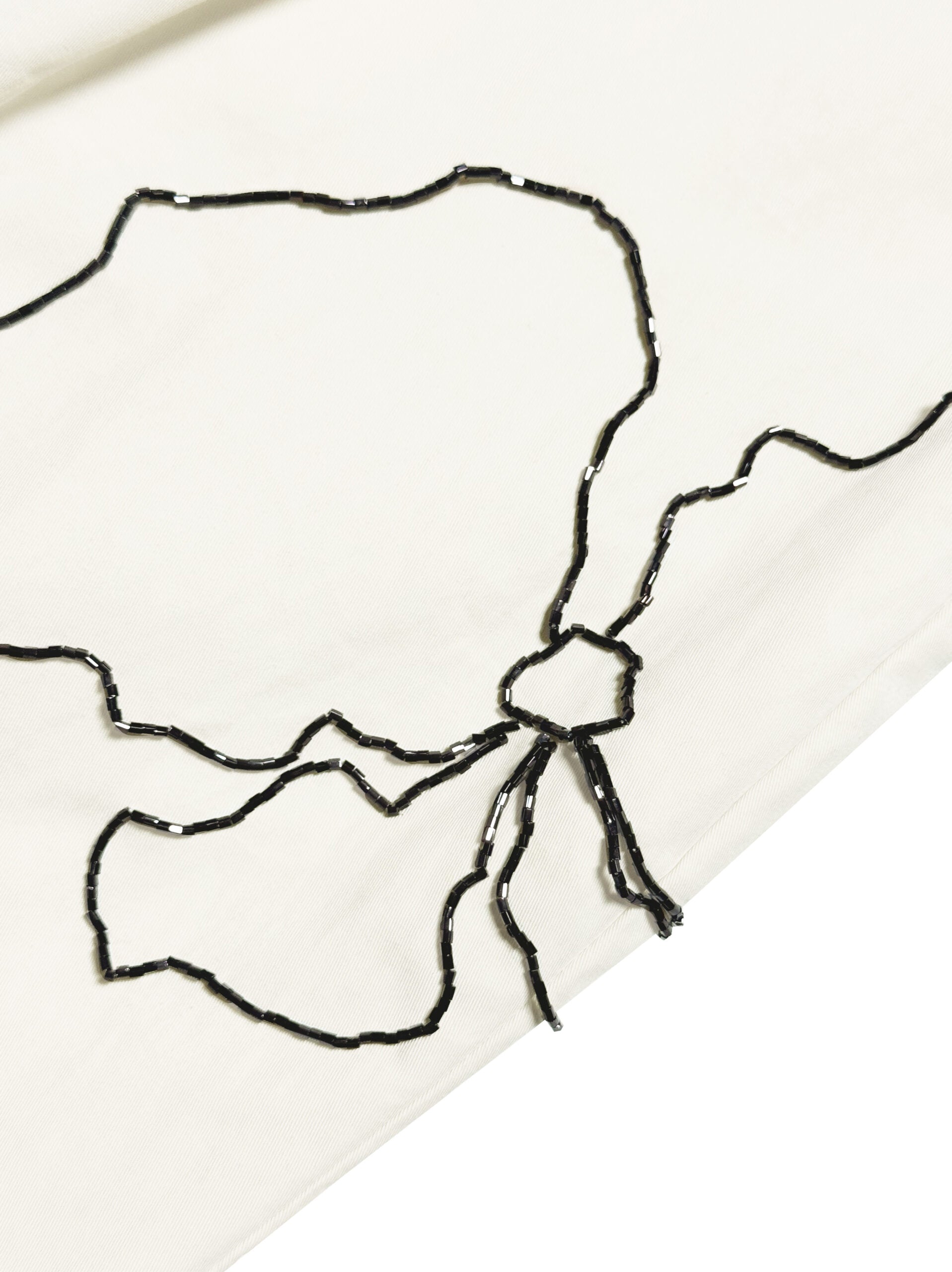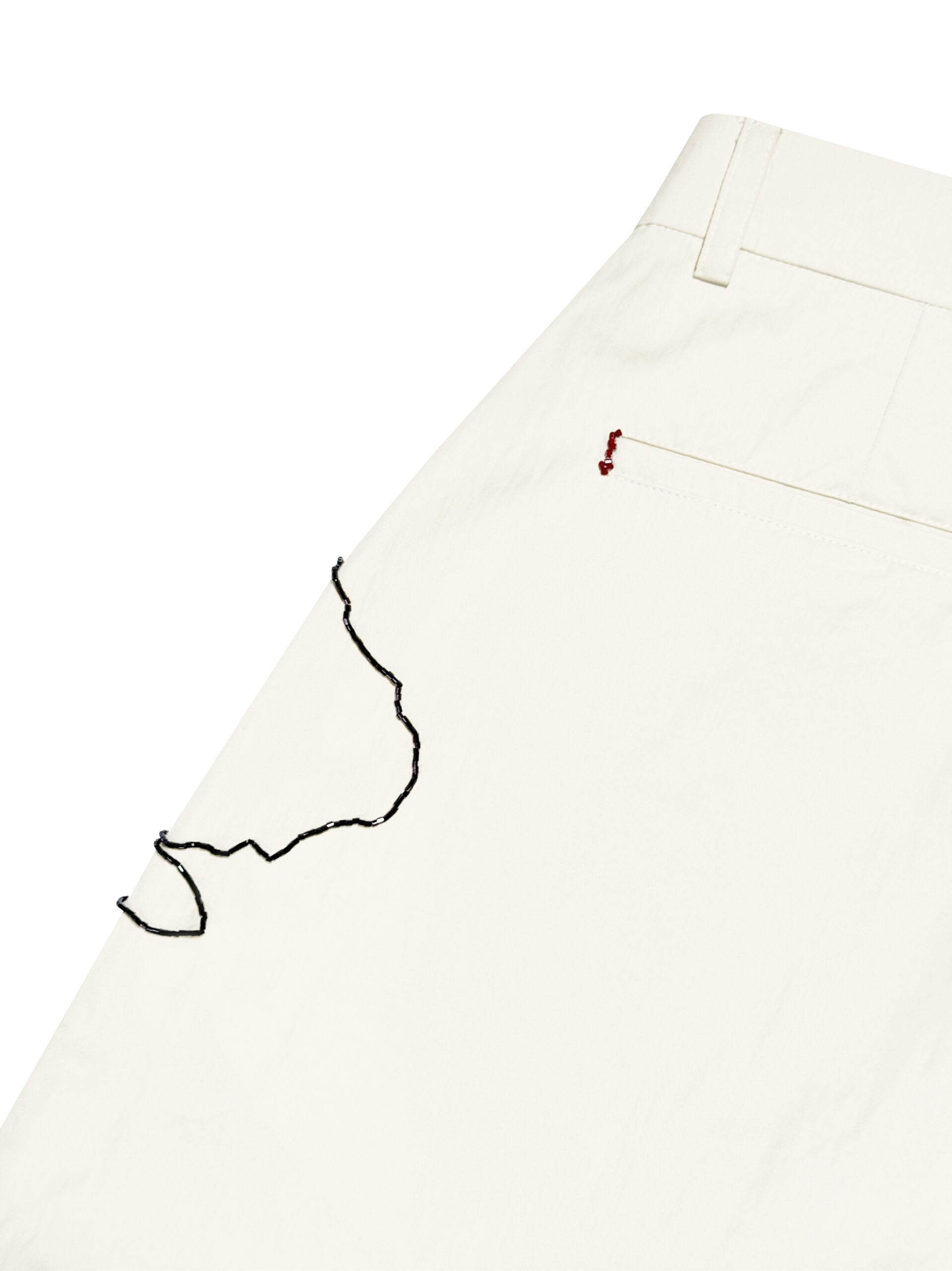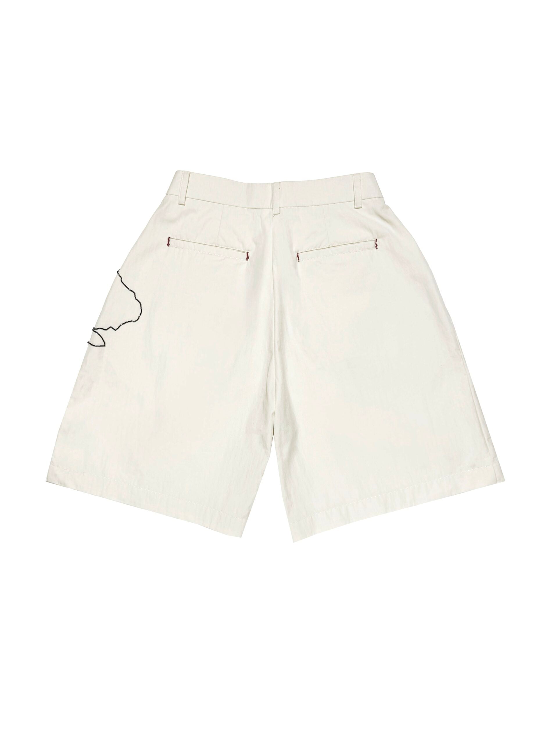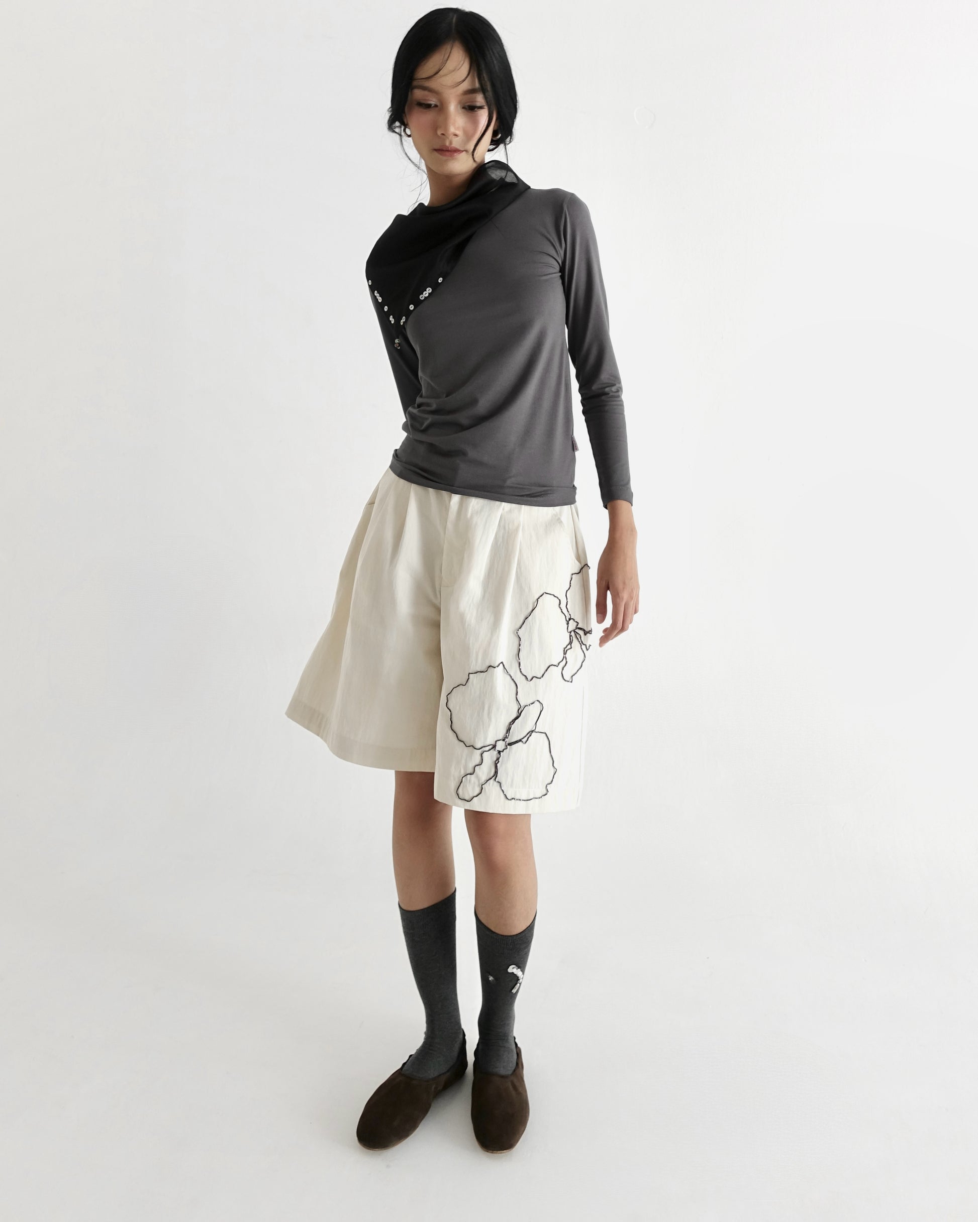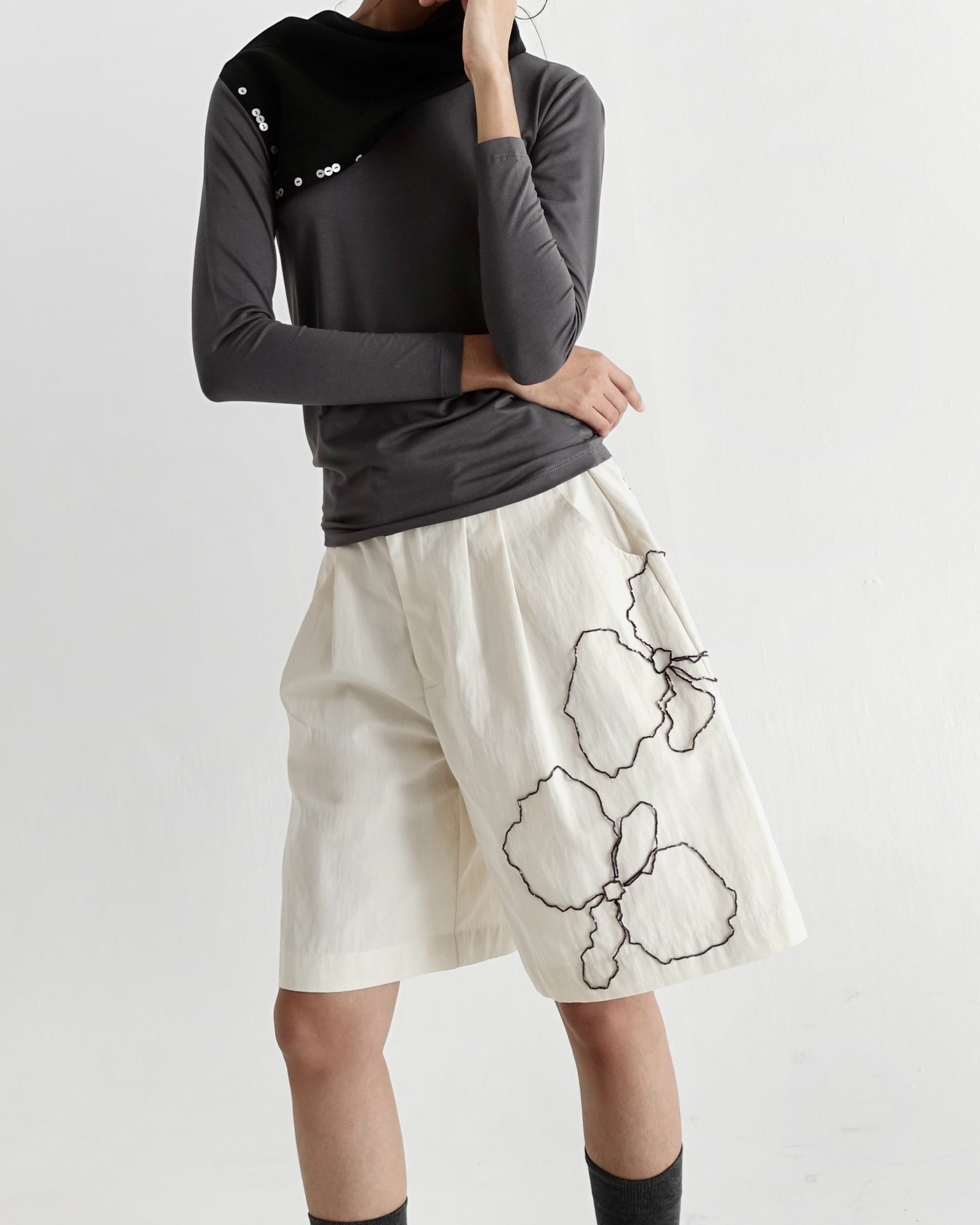 Wide-leg bermuda shorts constructed in mid-rise length with belt loops, finished with a hook, zip fly fastening, and double front & back pockets. Adorned with hand-beaded embellishment details for a