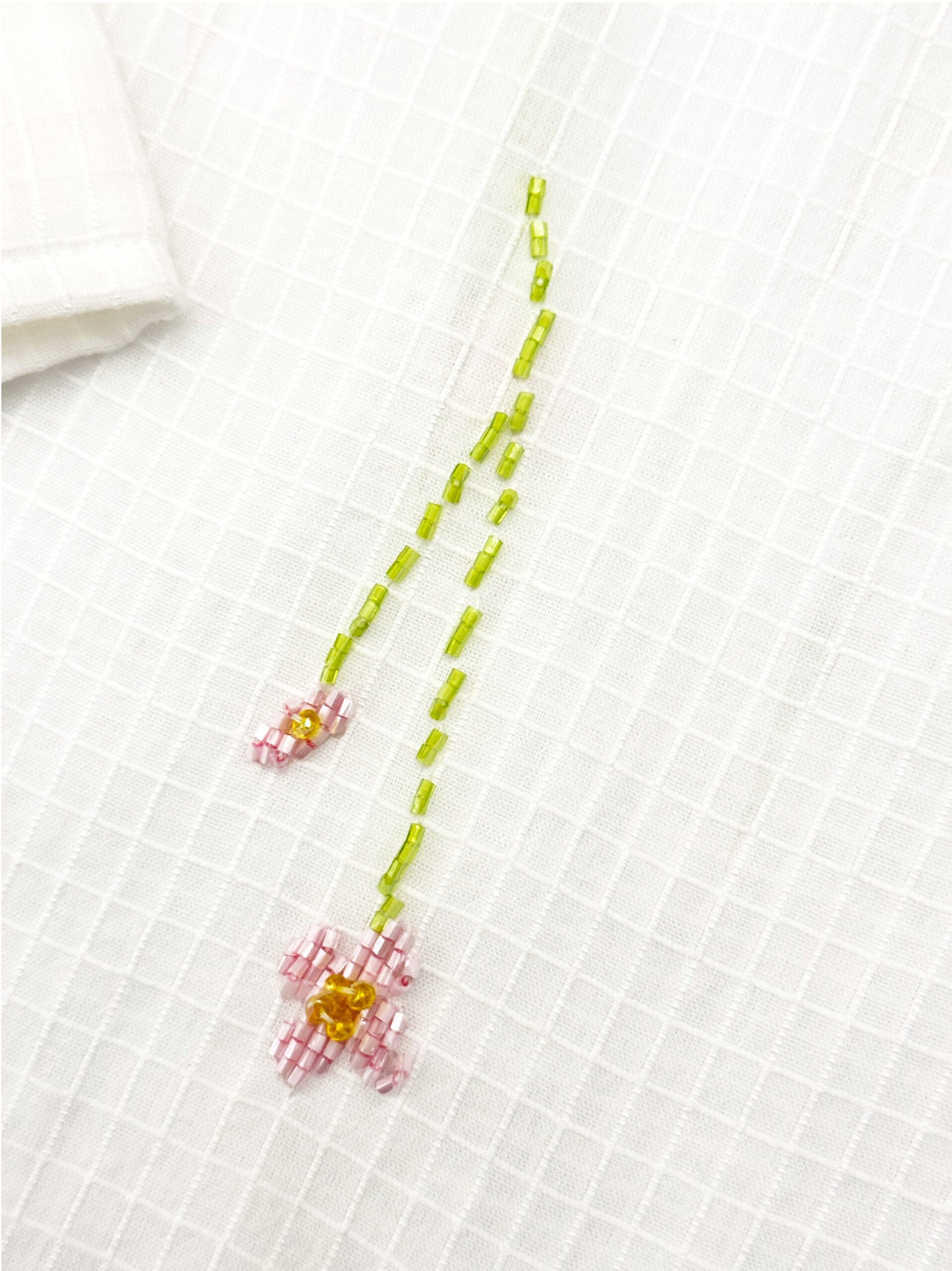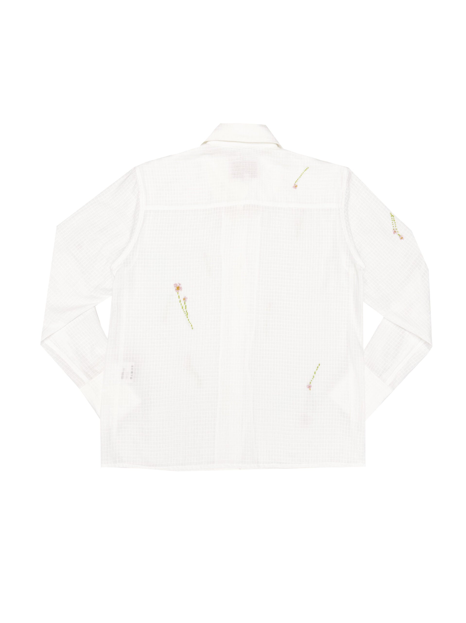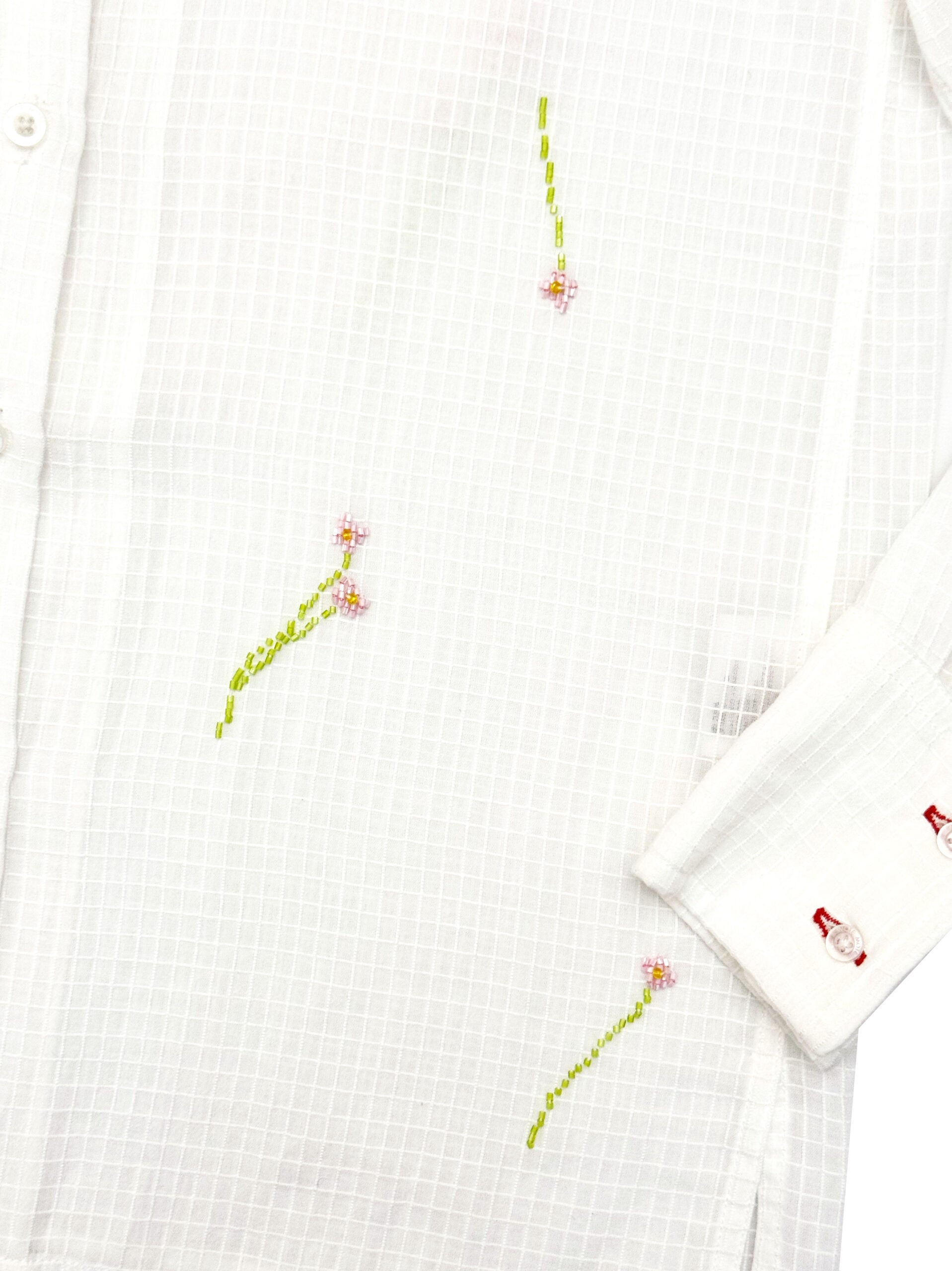 Fit-to-size version of our long sleeve shirts, made from cotton poplin fabric twisted with beaded flower ornaments. Finished with long, French cuffed sleeves and matte pearlescent Mote Mote buttons.