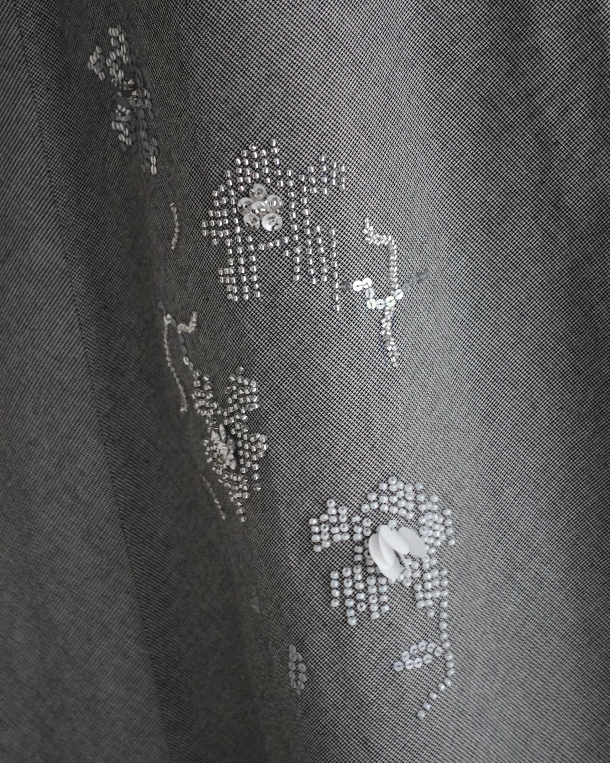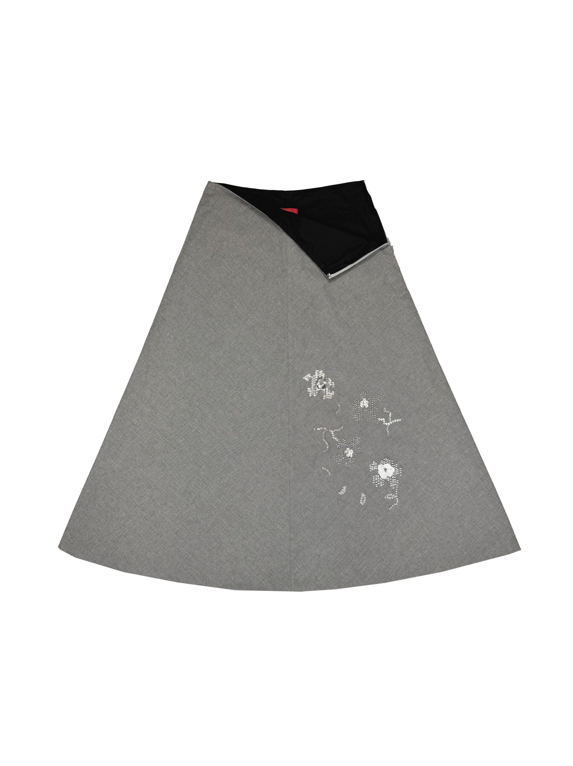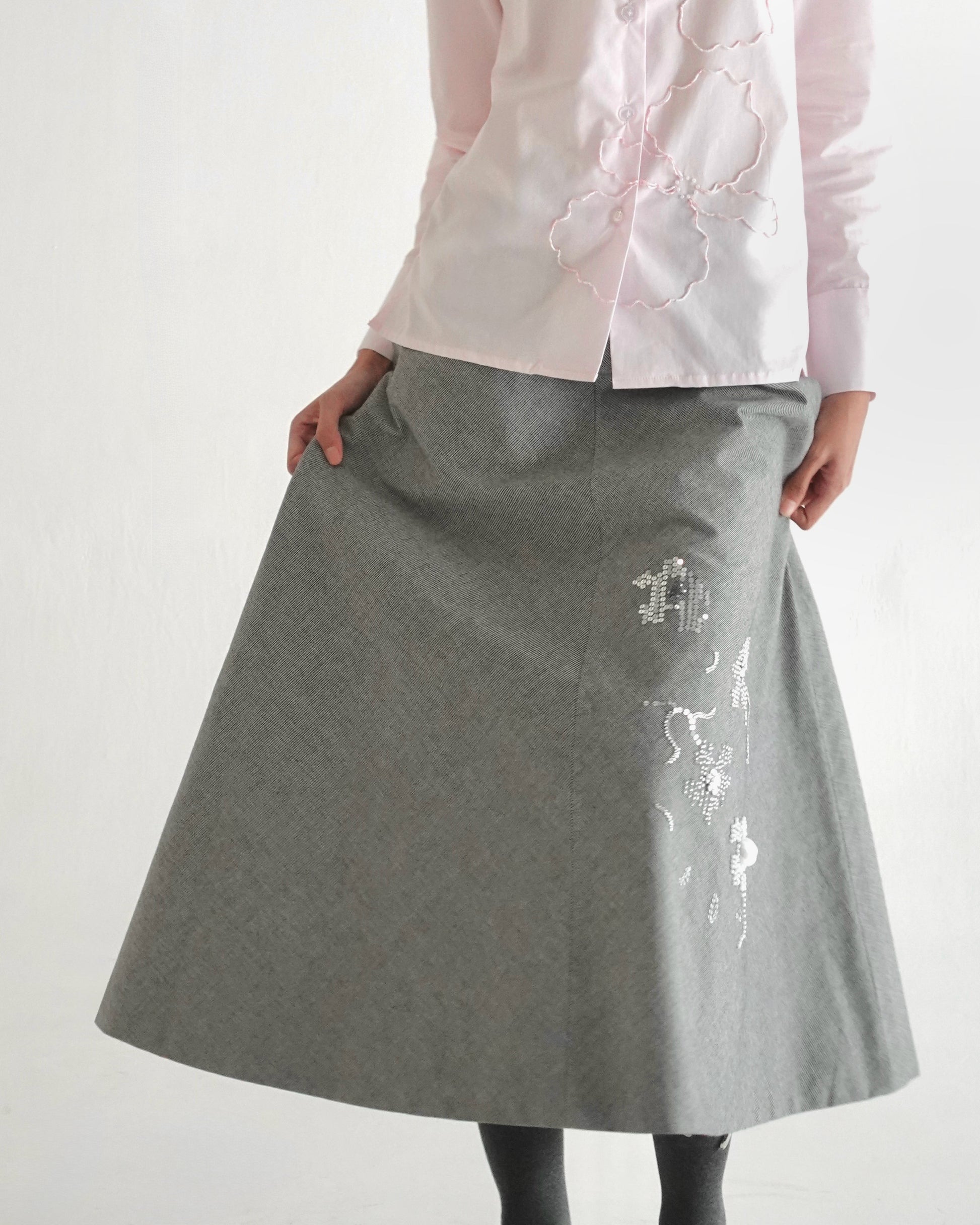 Flared silhouette of Mote Mote’s midi skirt made of structured fabric with flower handstitched detailing, finished with side-zip opening and interlining.