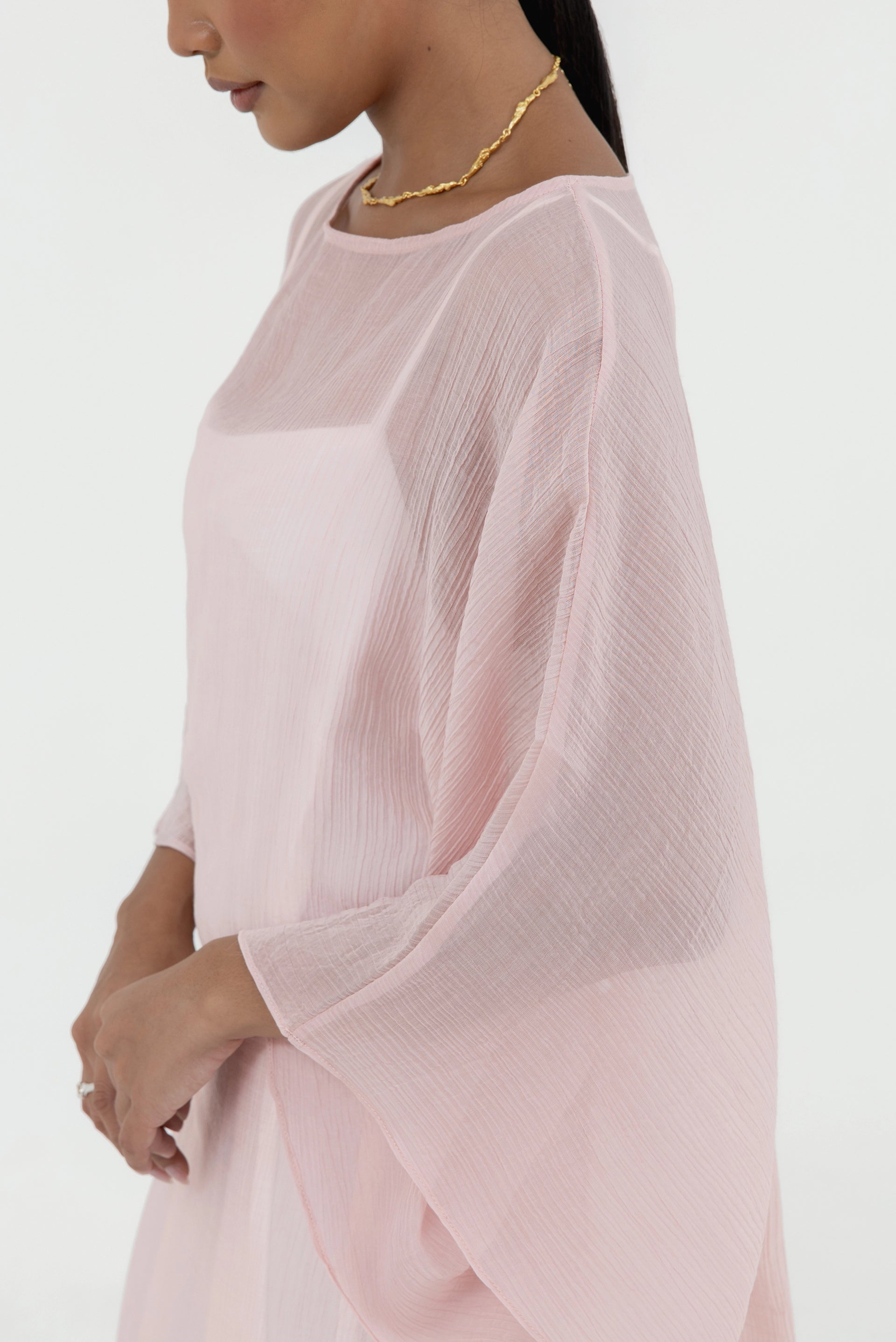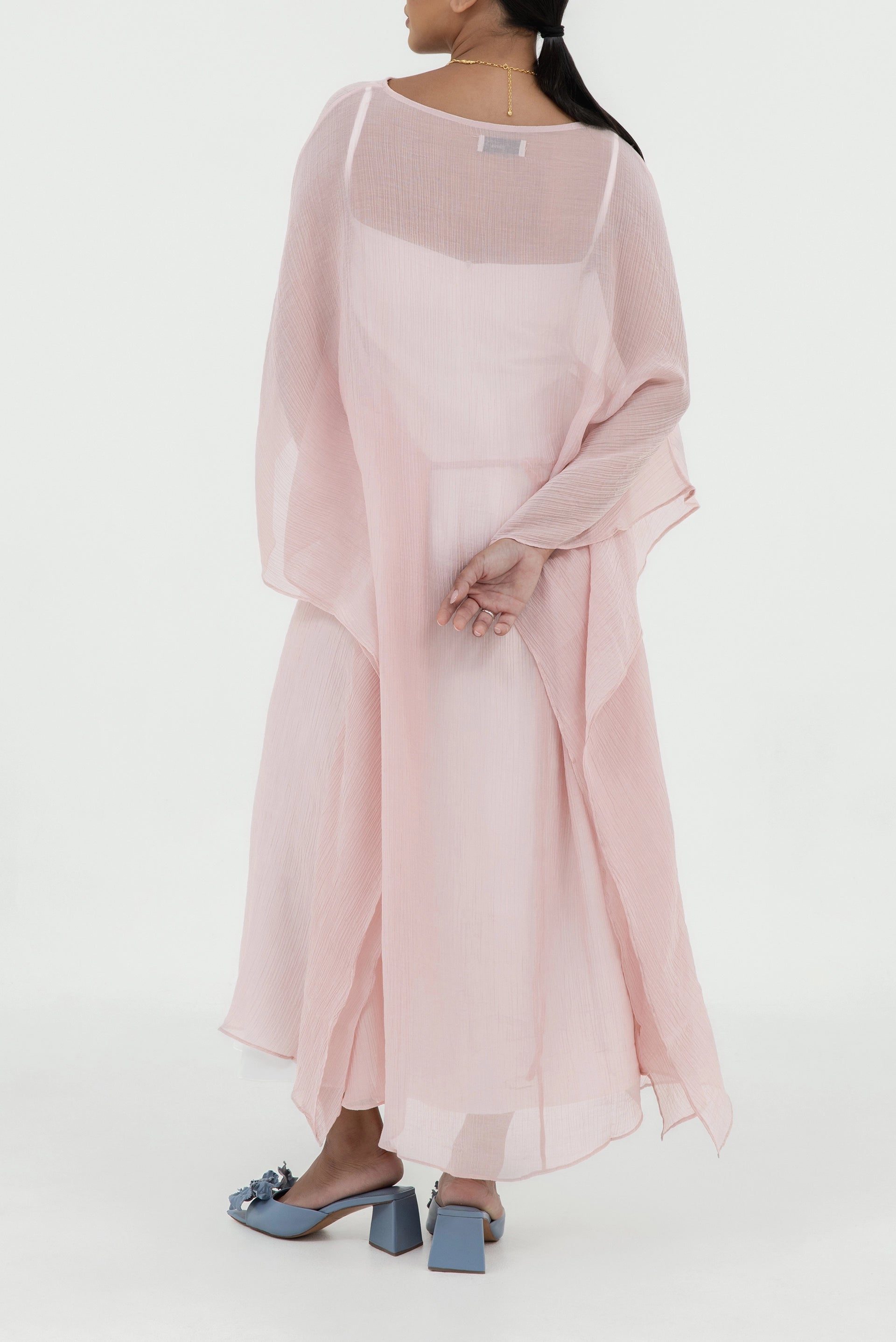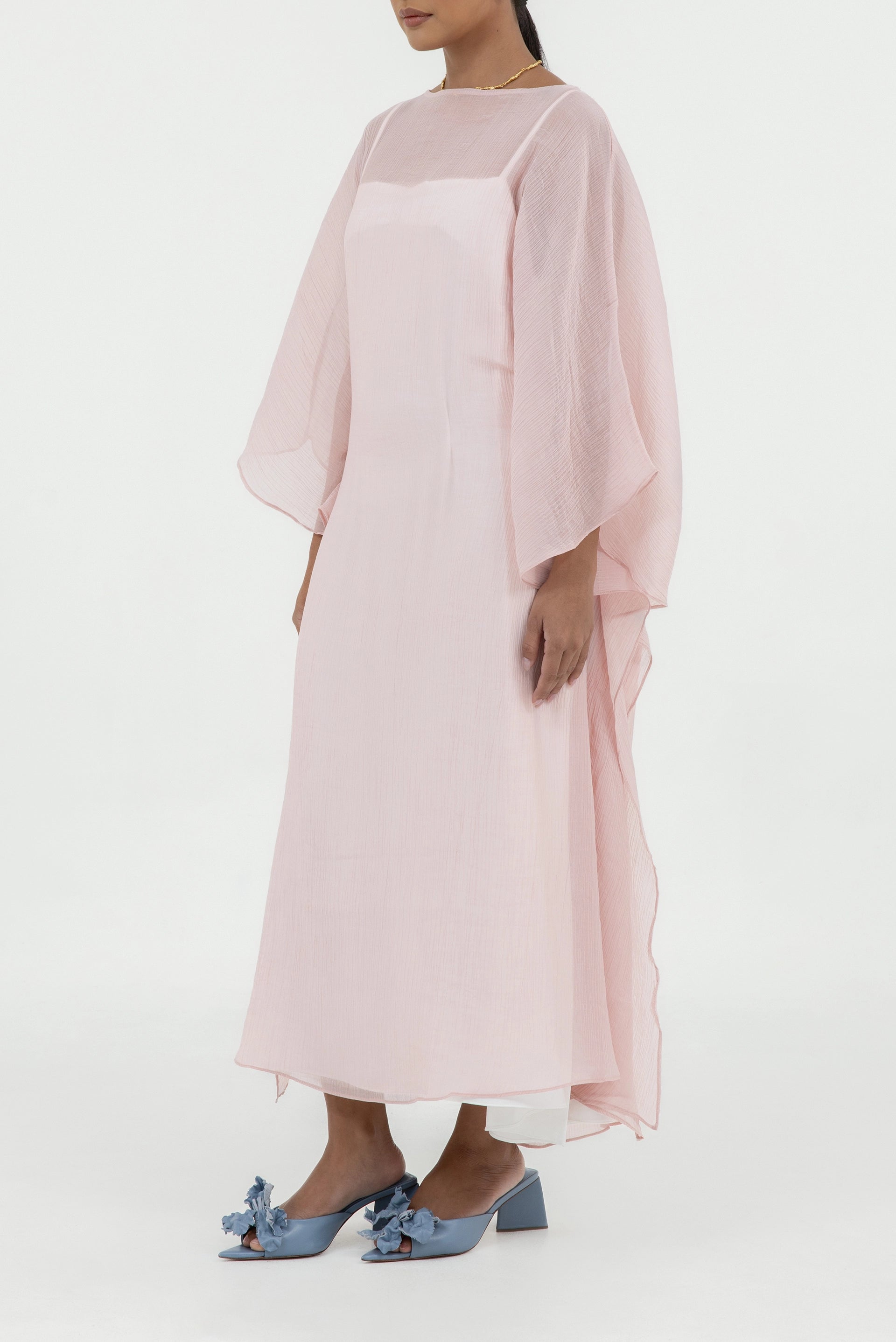 A dual-colored flowy, sheer kaftan-style dress, offering an elegant and artistic silhouette perfect for statement evening wear