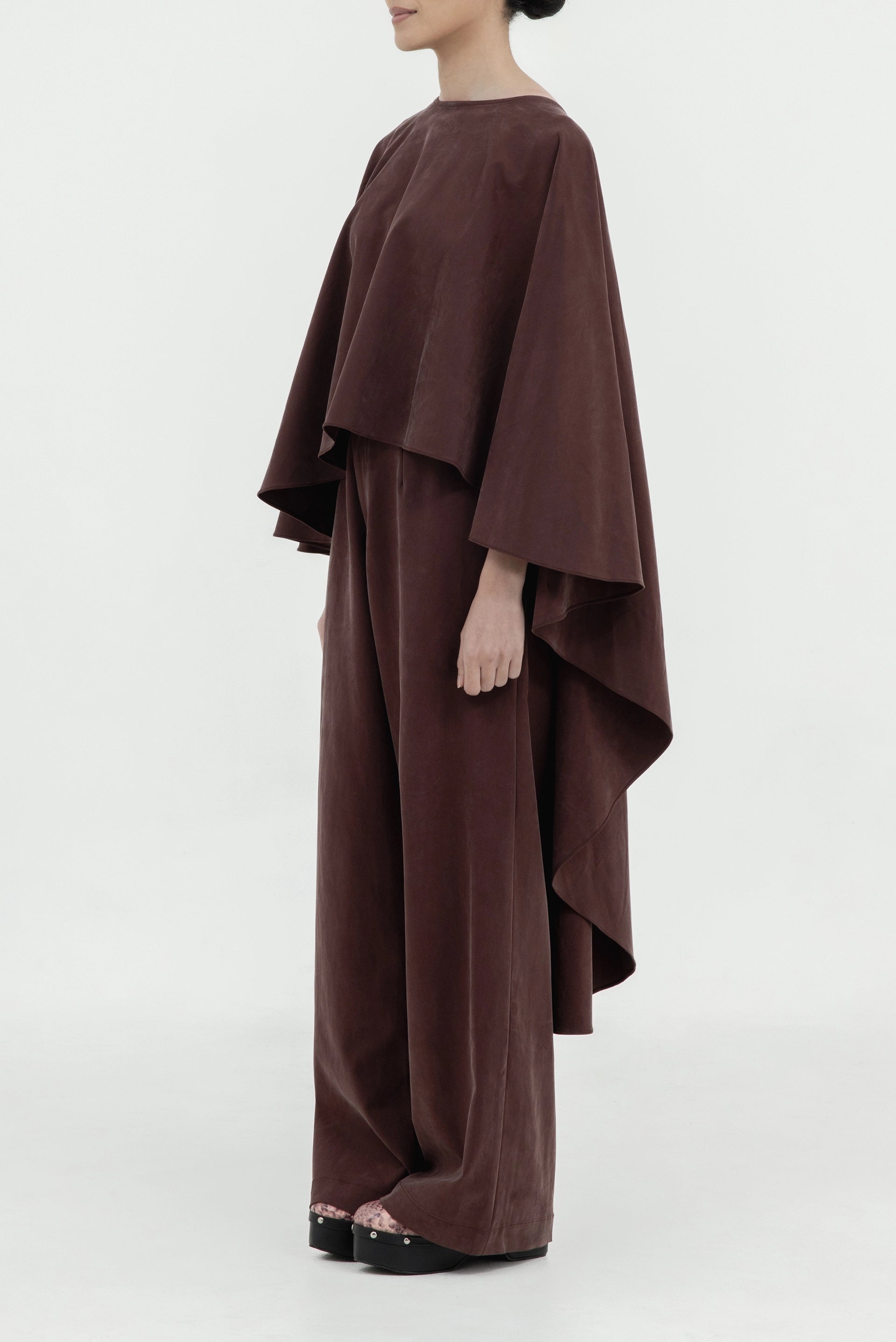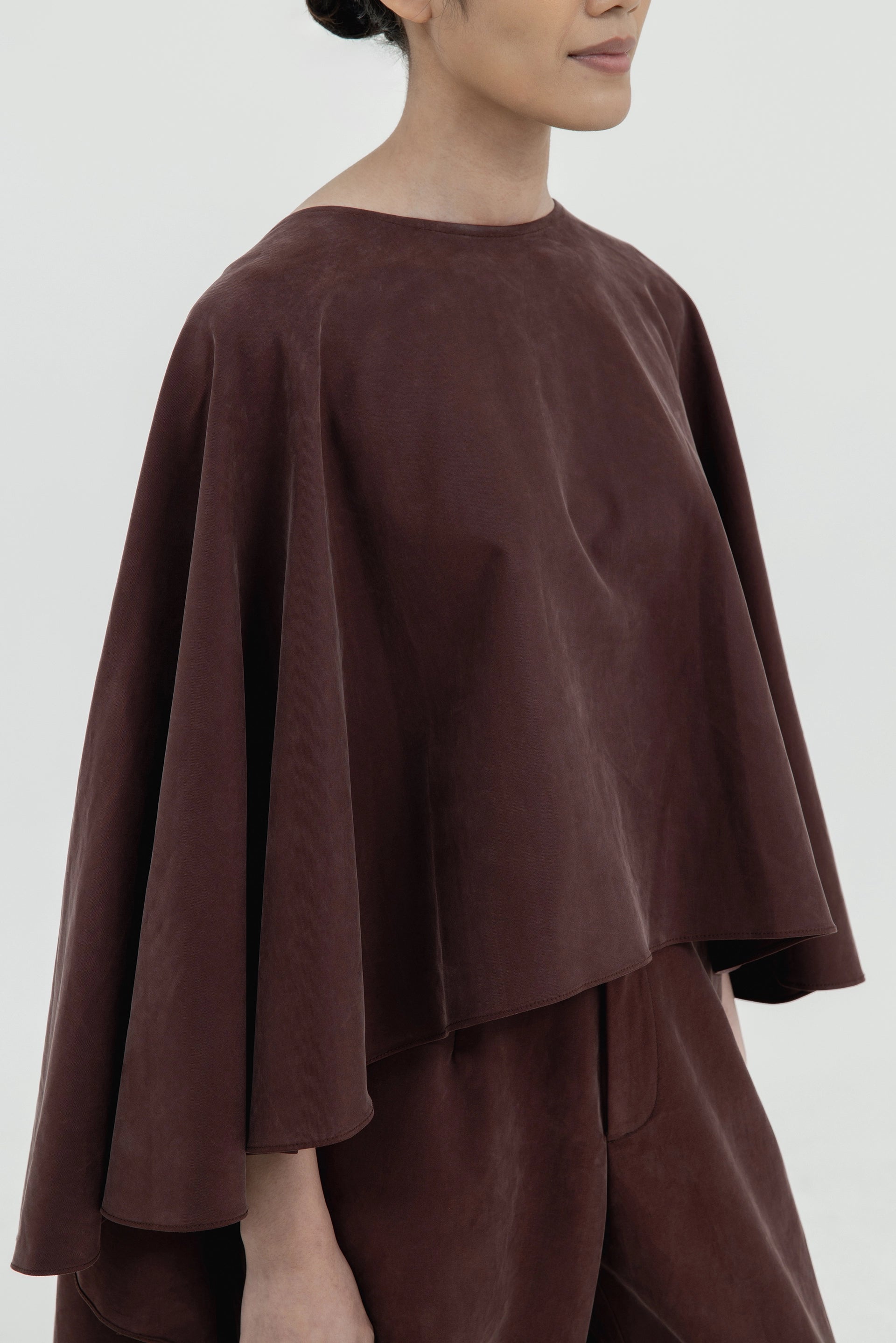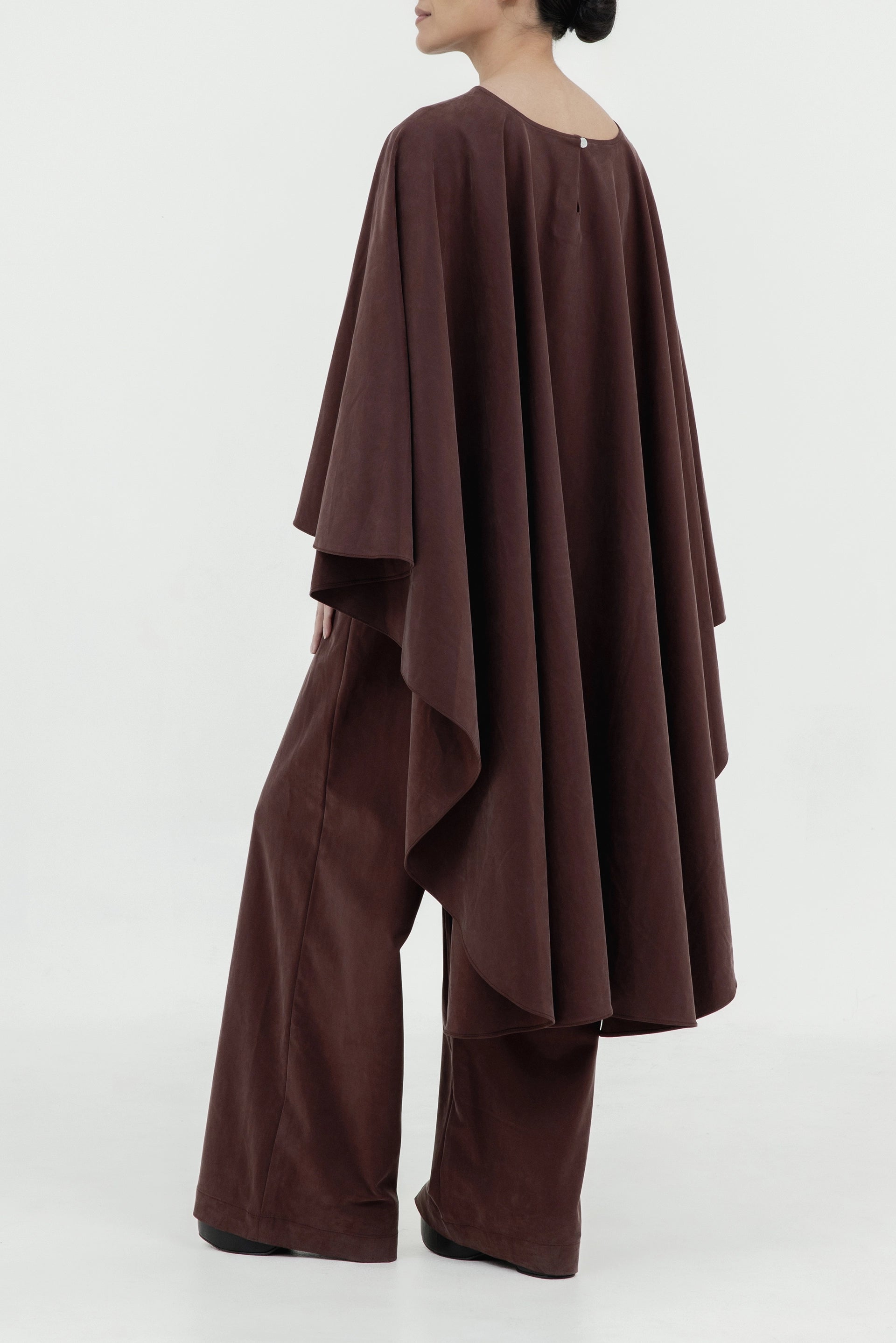 An elegant cape blouse crafted from soft flowy material, featuring a waist-length front and an elongated back, blending dramatic flair with sophisticated design
