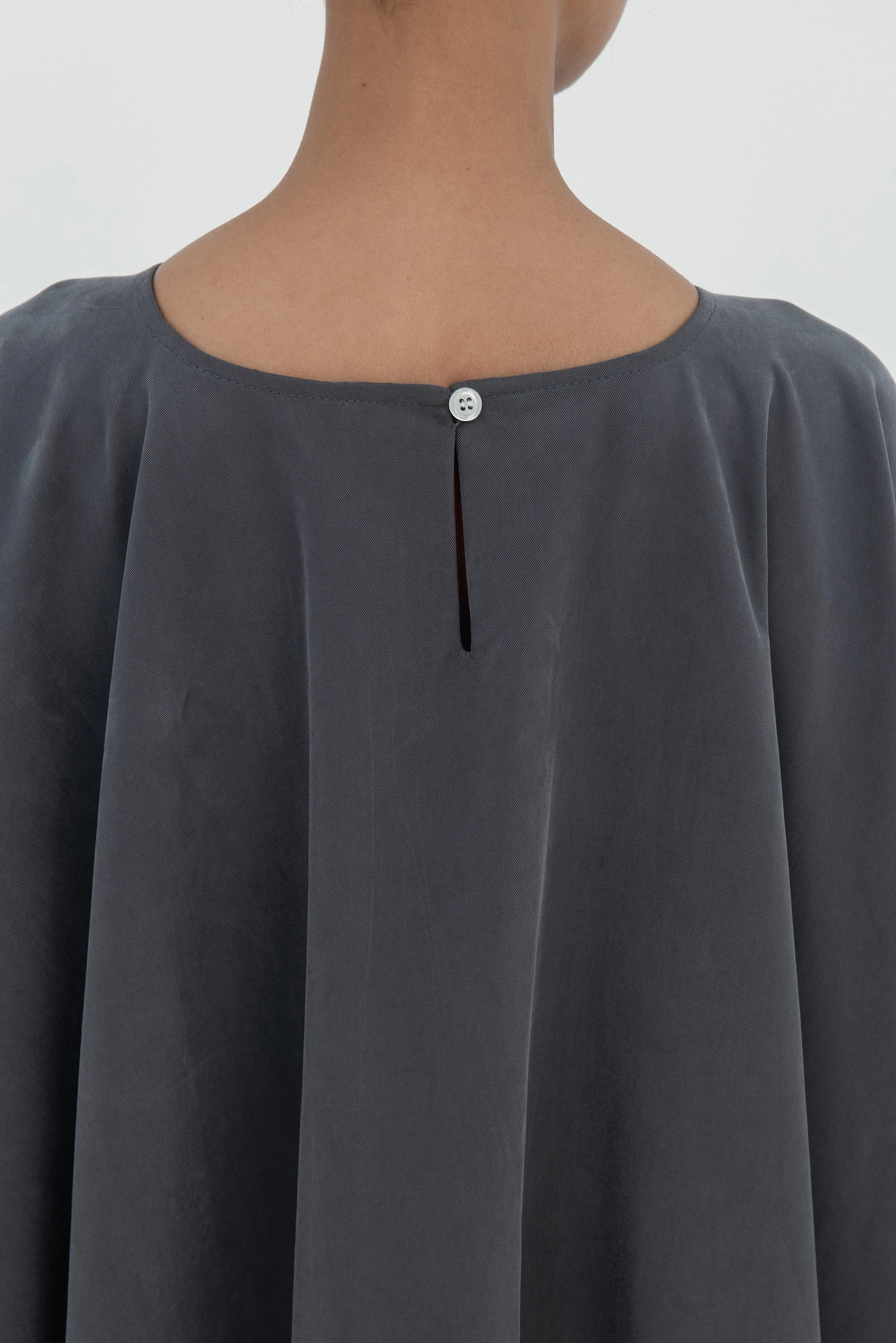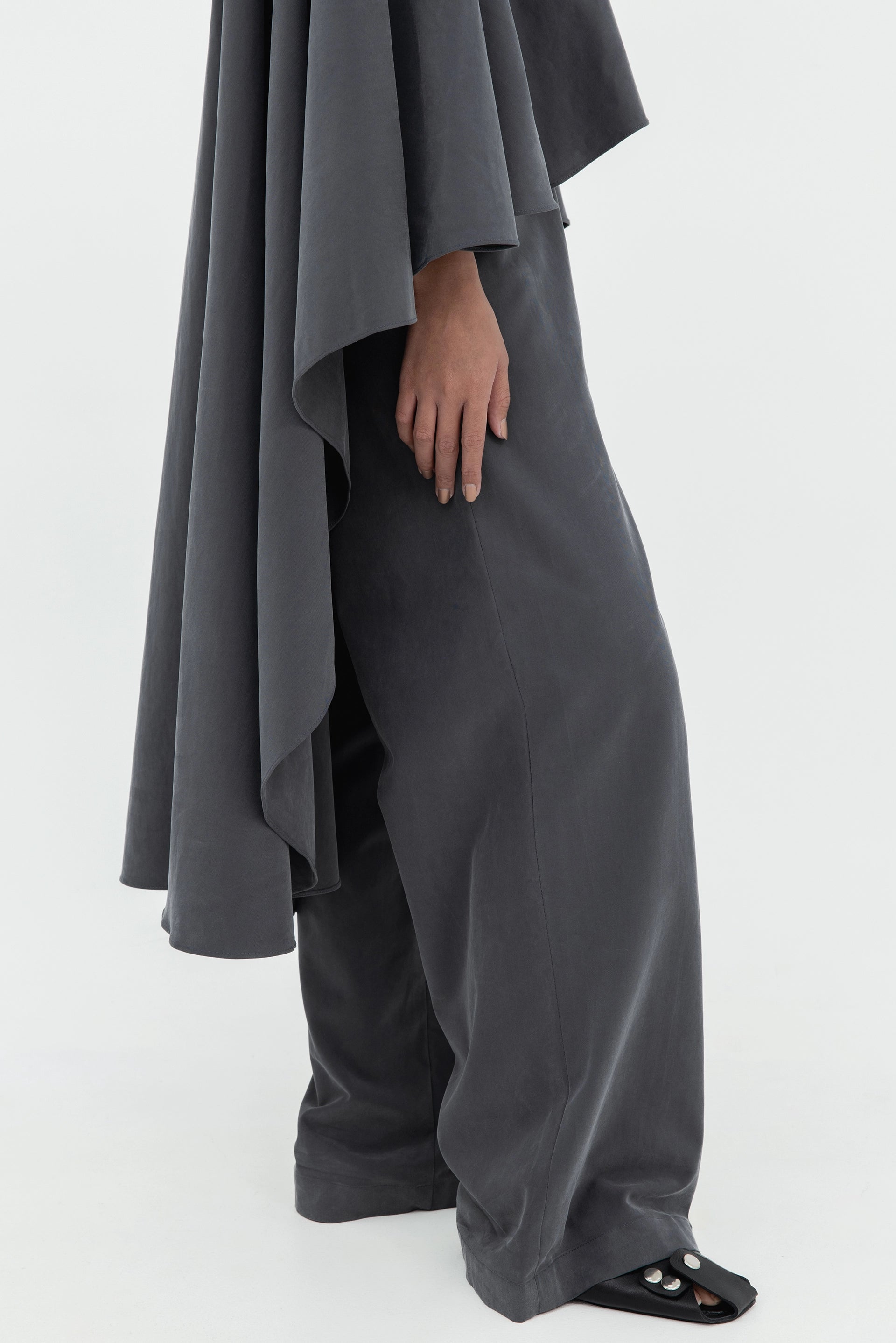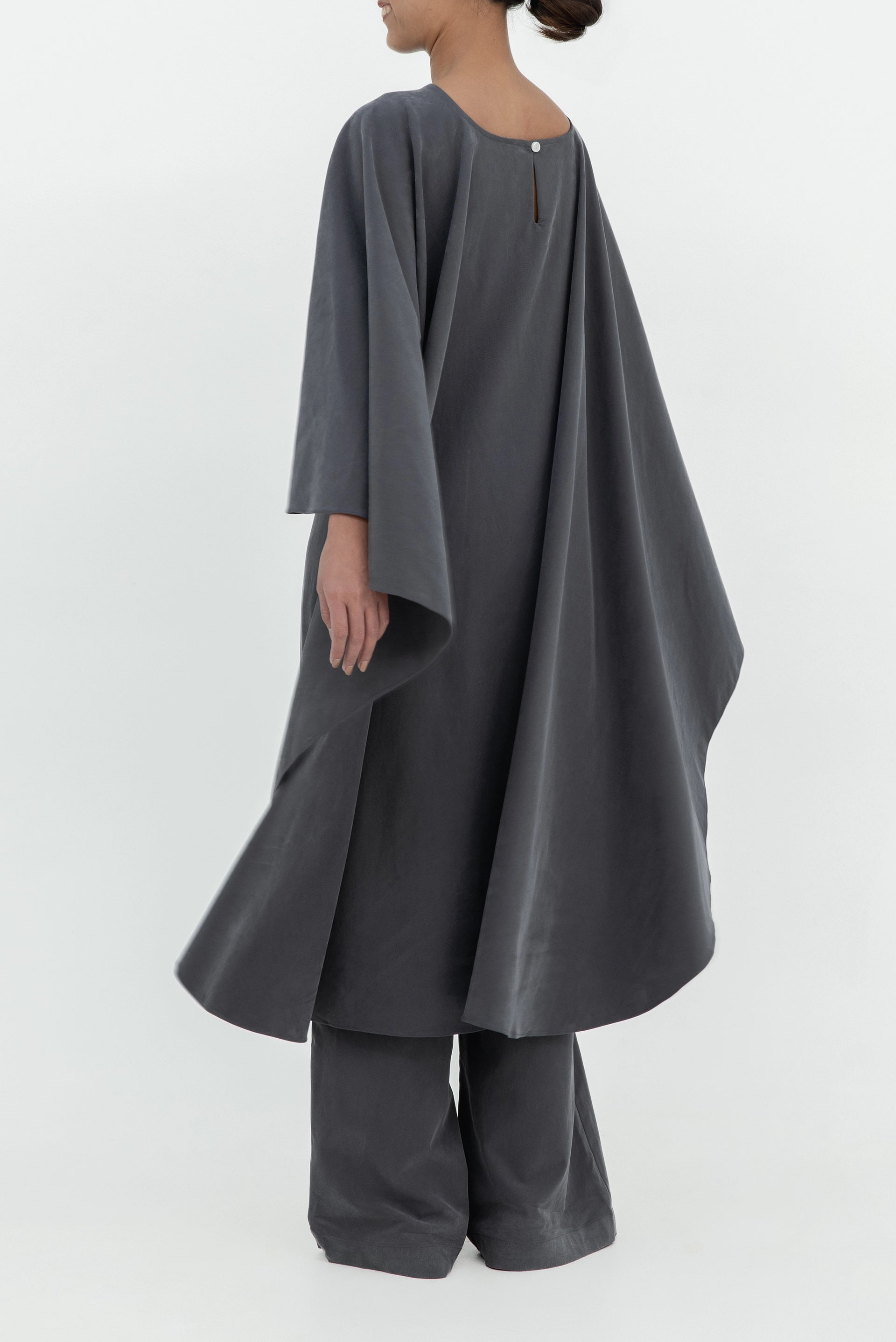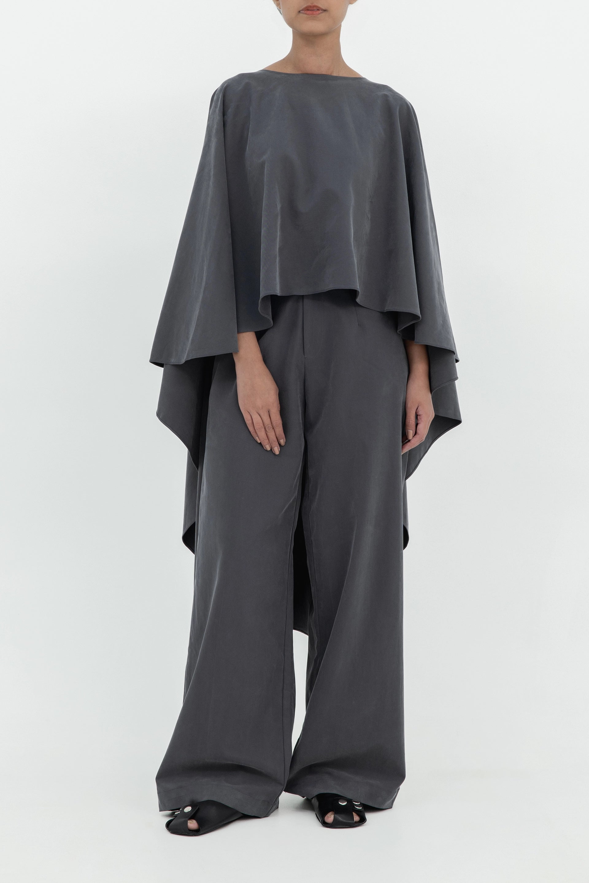 An elegant cape blouse crafted from soft flowy material, featuring a waist-length front and an elongated back, blending dramatic flair with sophisticated design