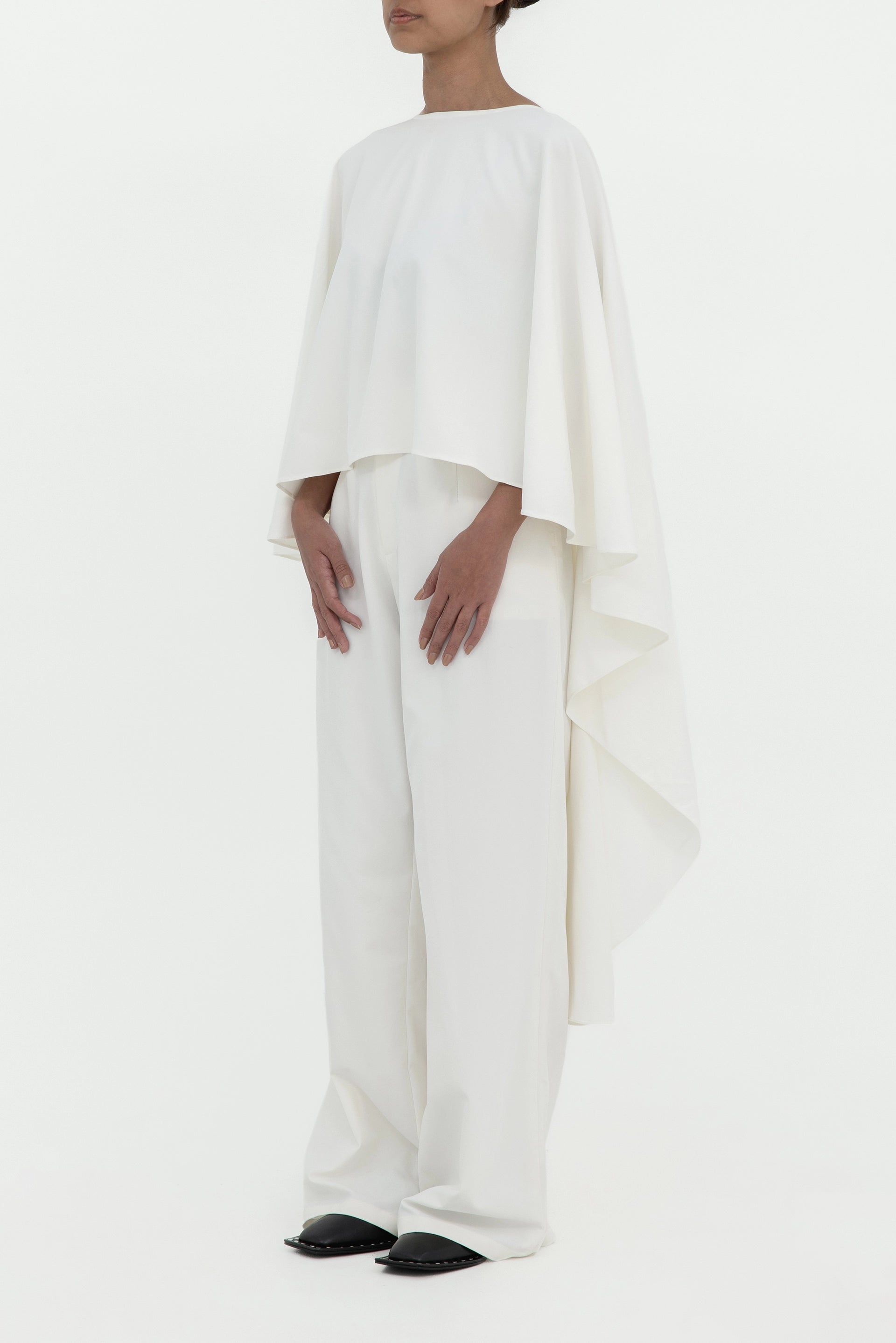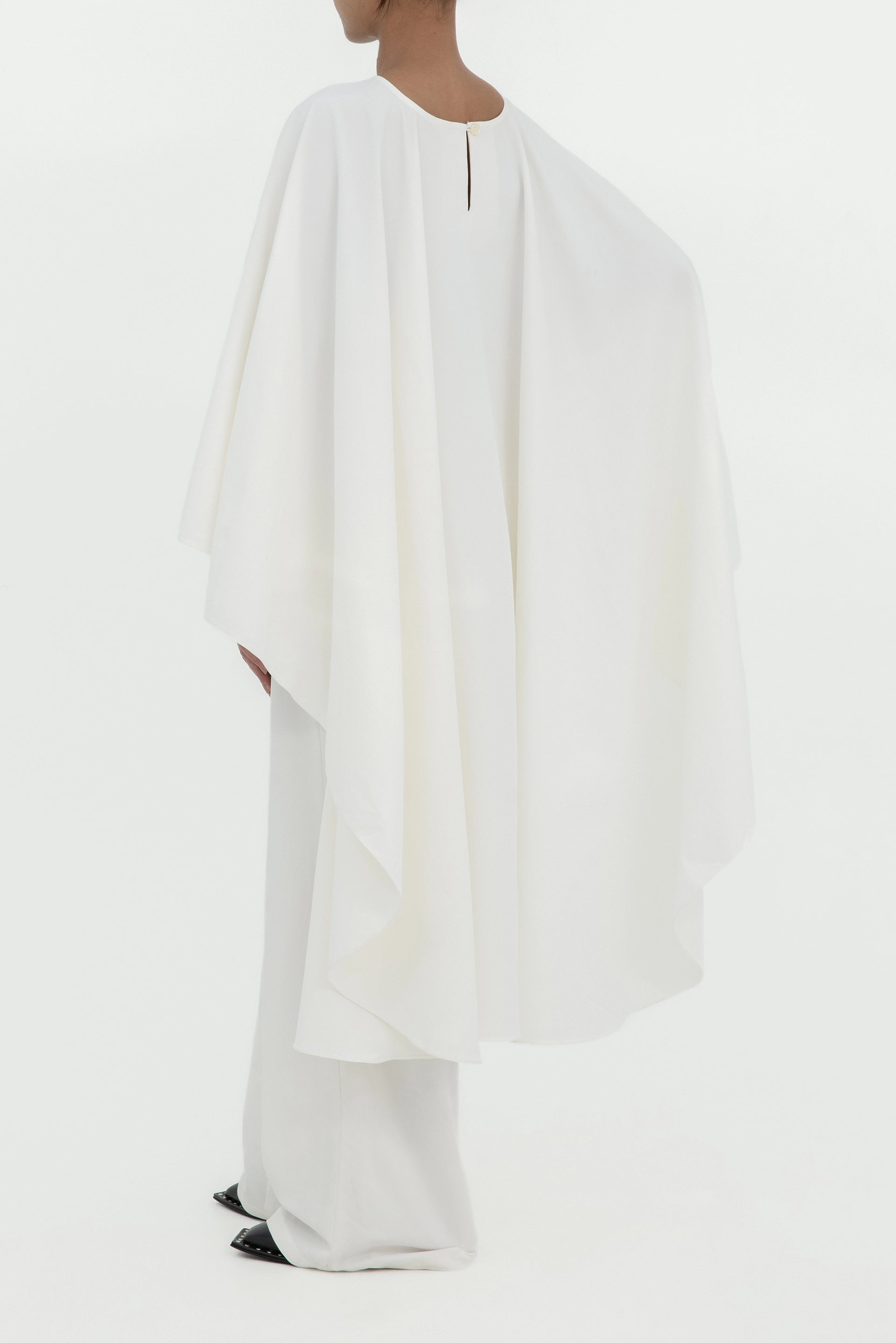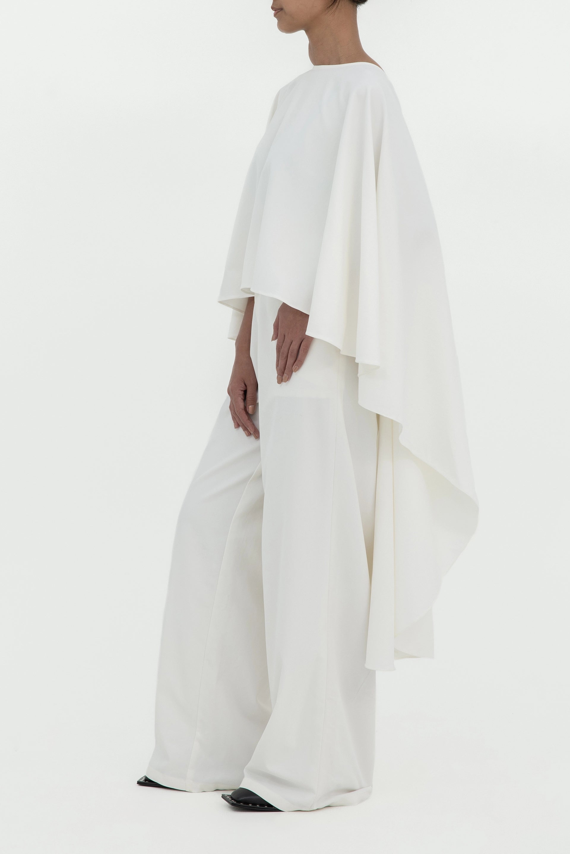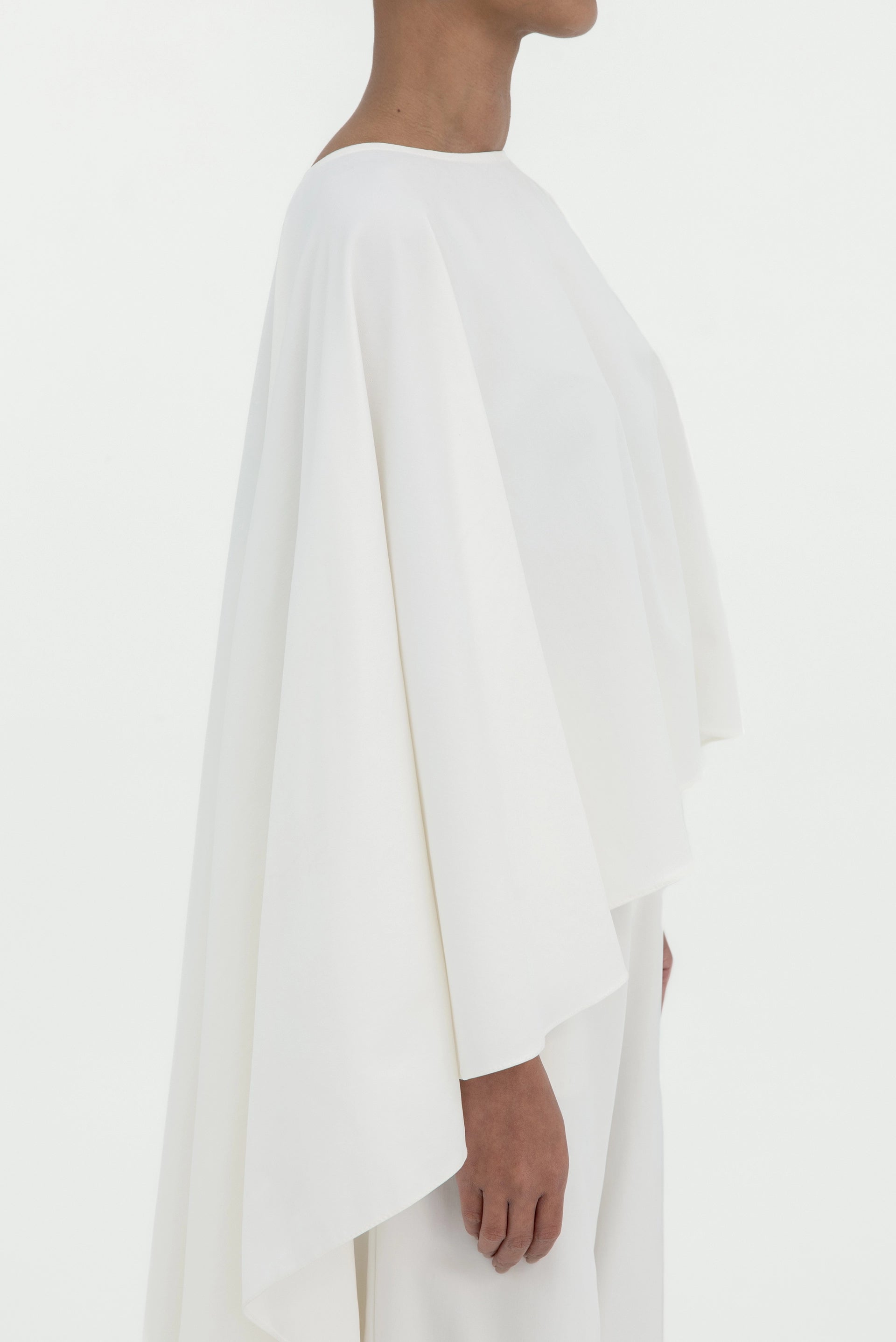 An elegant cape blouse crafted from soft flowy material, featuring a waist-length front and an elongated back, blending dramatic flair with sophisticated design