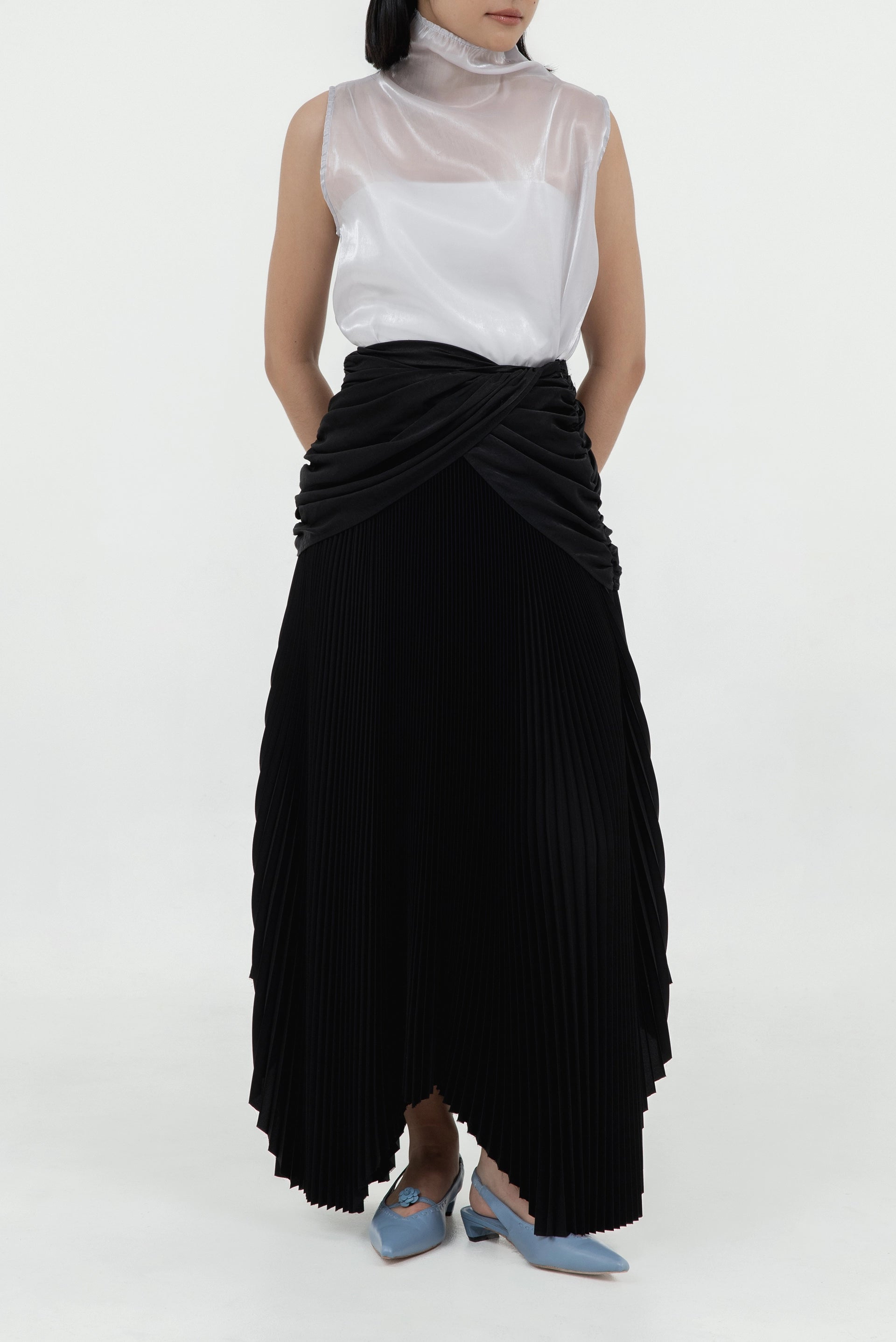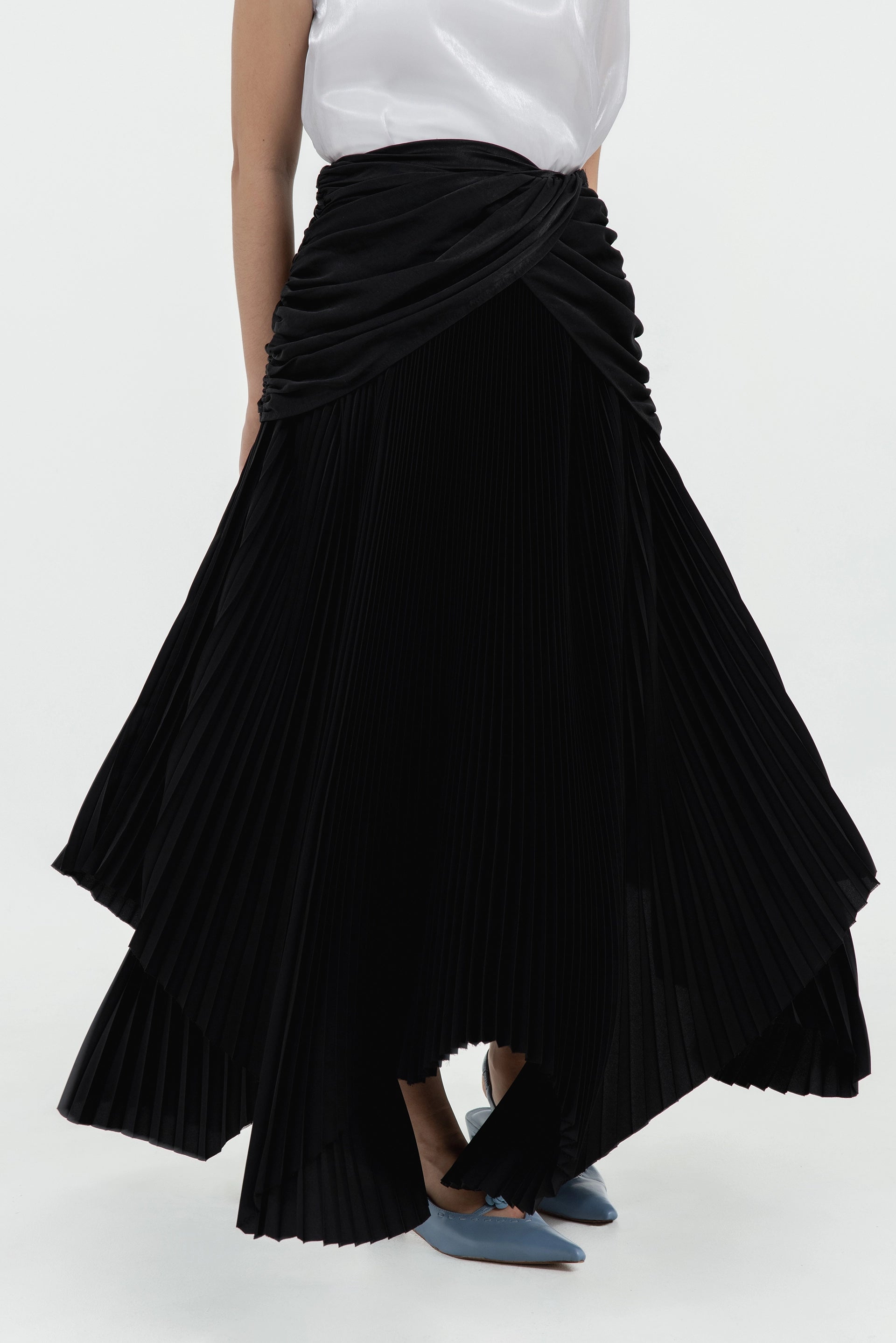 An asymmetrical Sunray pleated skirt that transitions from midi to maxi, featuring an elegant overlapped drapery from the waist to the hips for a feminine look