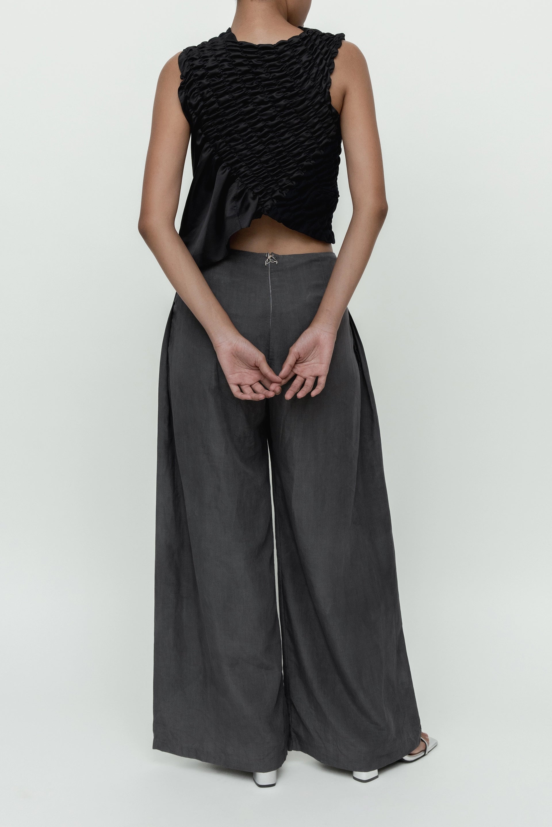 knife-pleat trousers with ANW signature flower button details.