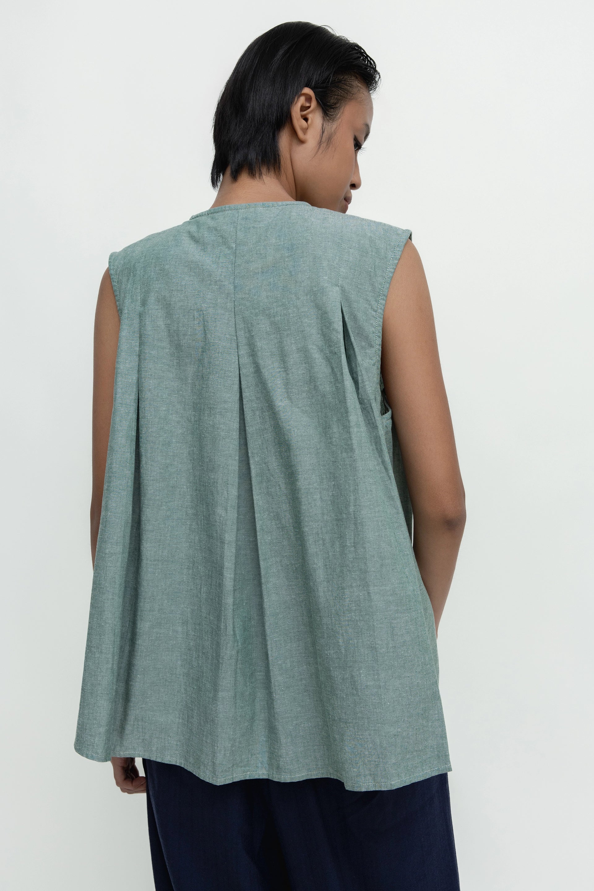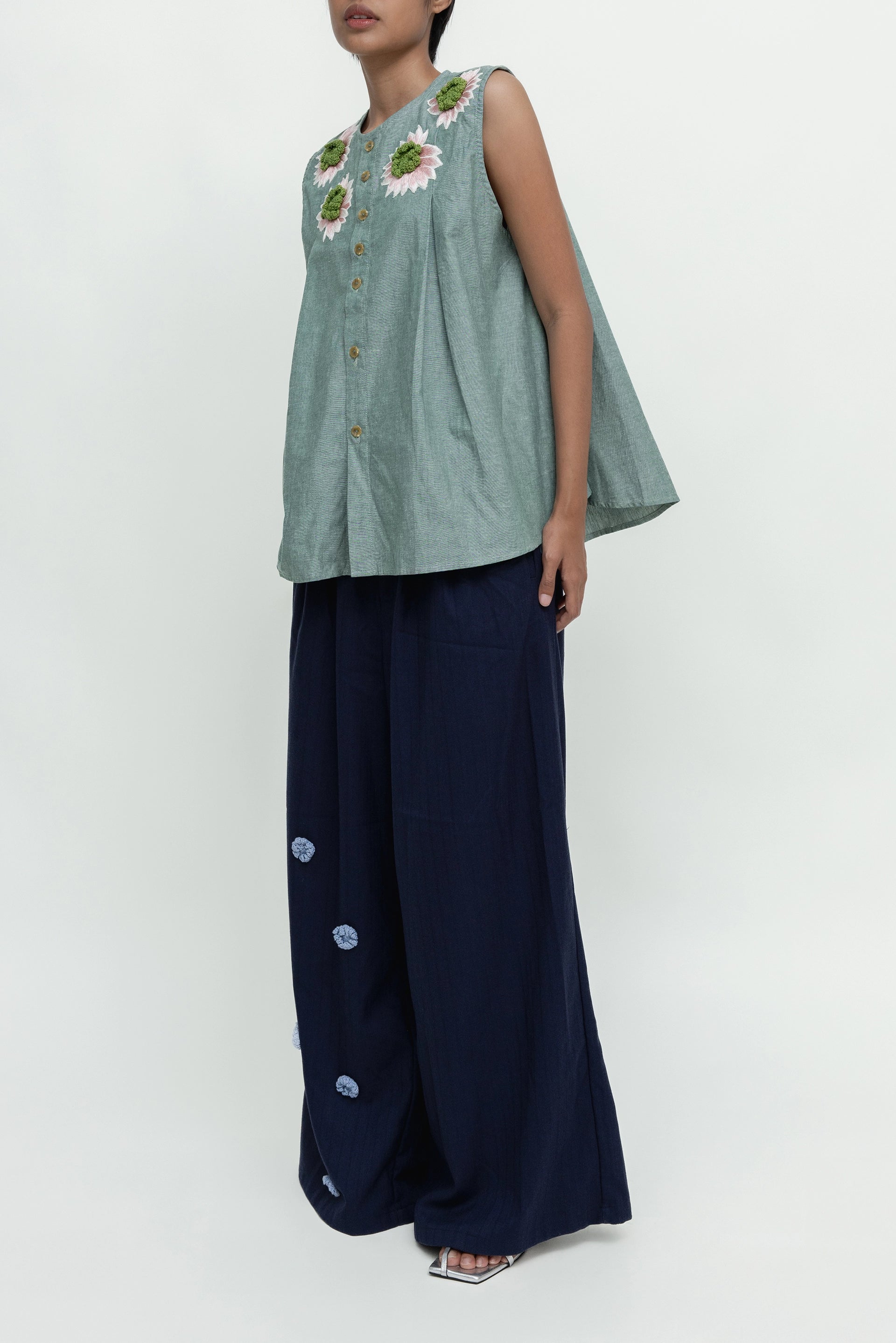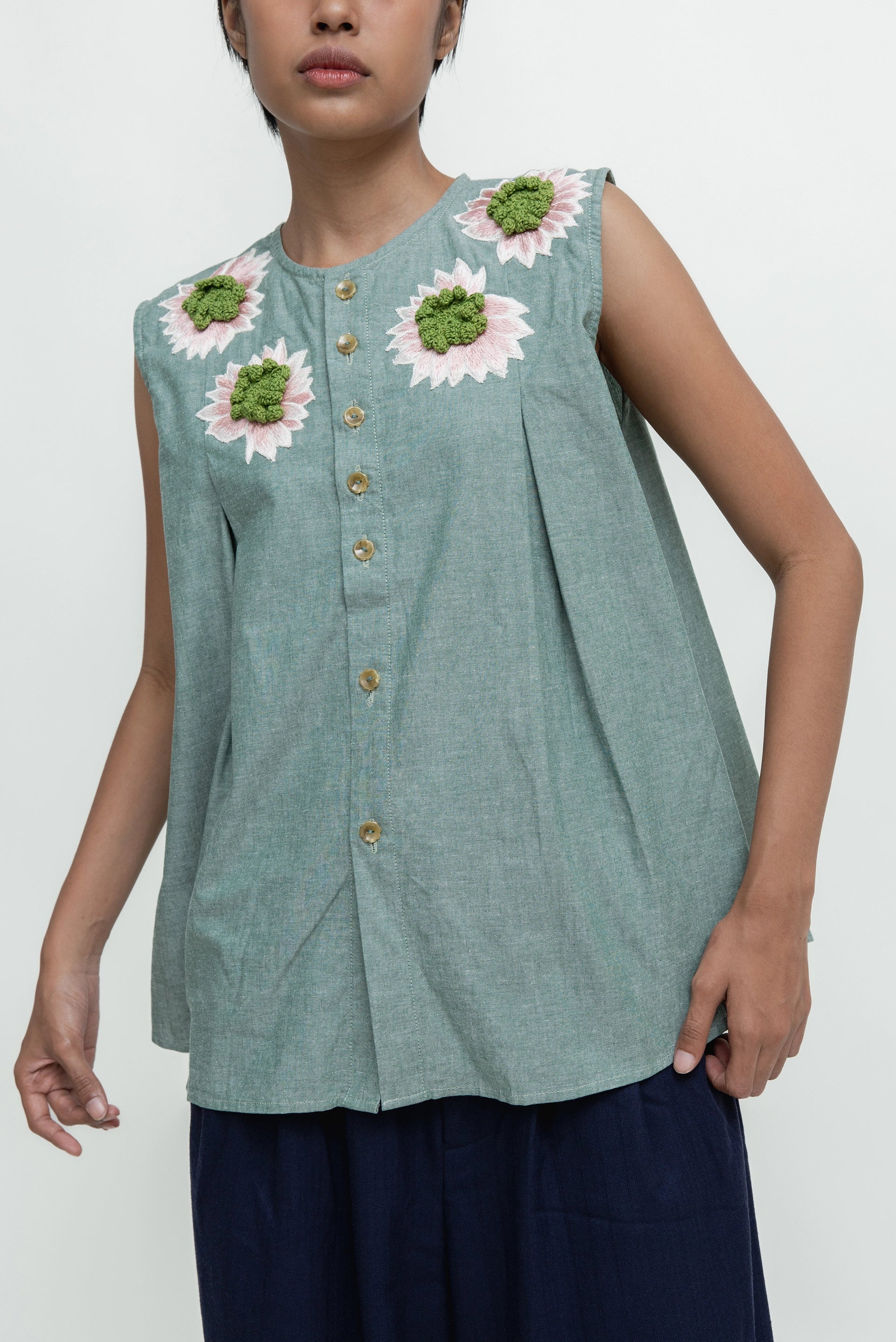 A green vest featuring acrylic floral buttons and dimensional 4D flower detailing, complemented by pleated construction at the back. Thoughtfully designed to add depth and texture, this piece combines sculptural details with a structured yet modern silhouette.