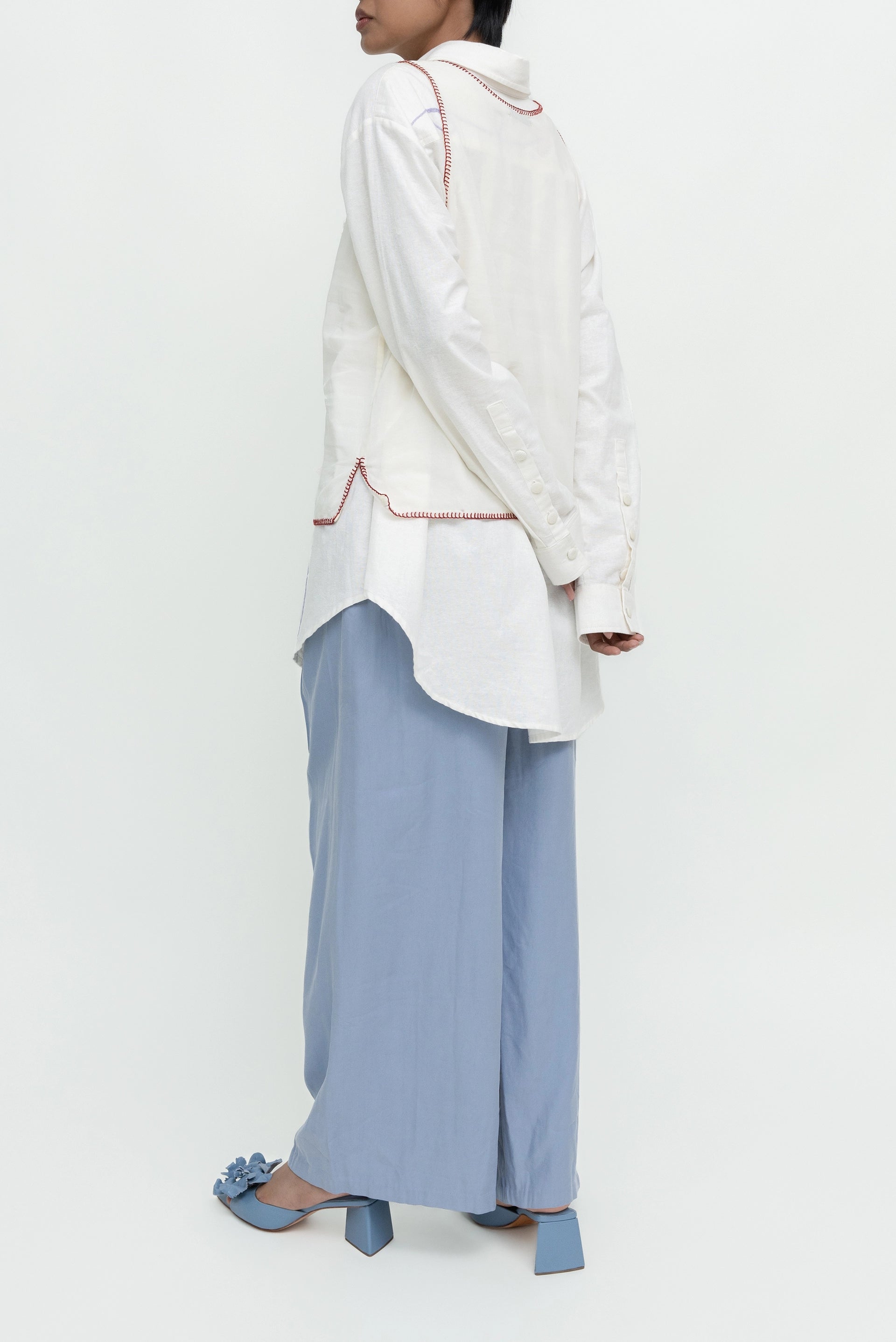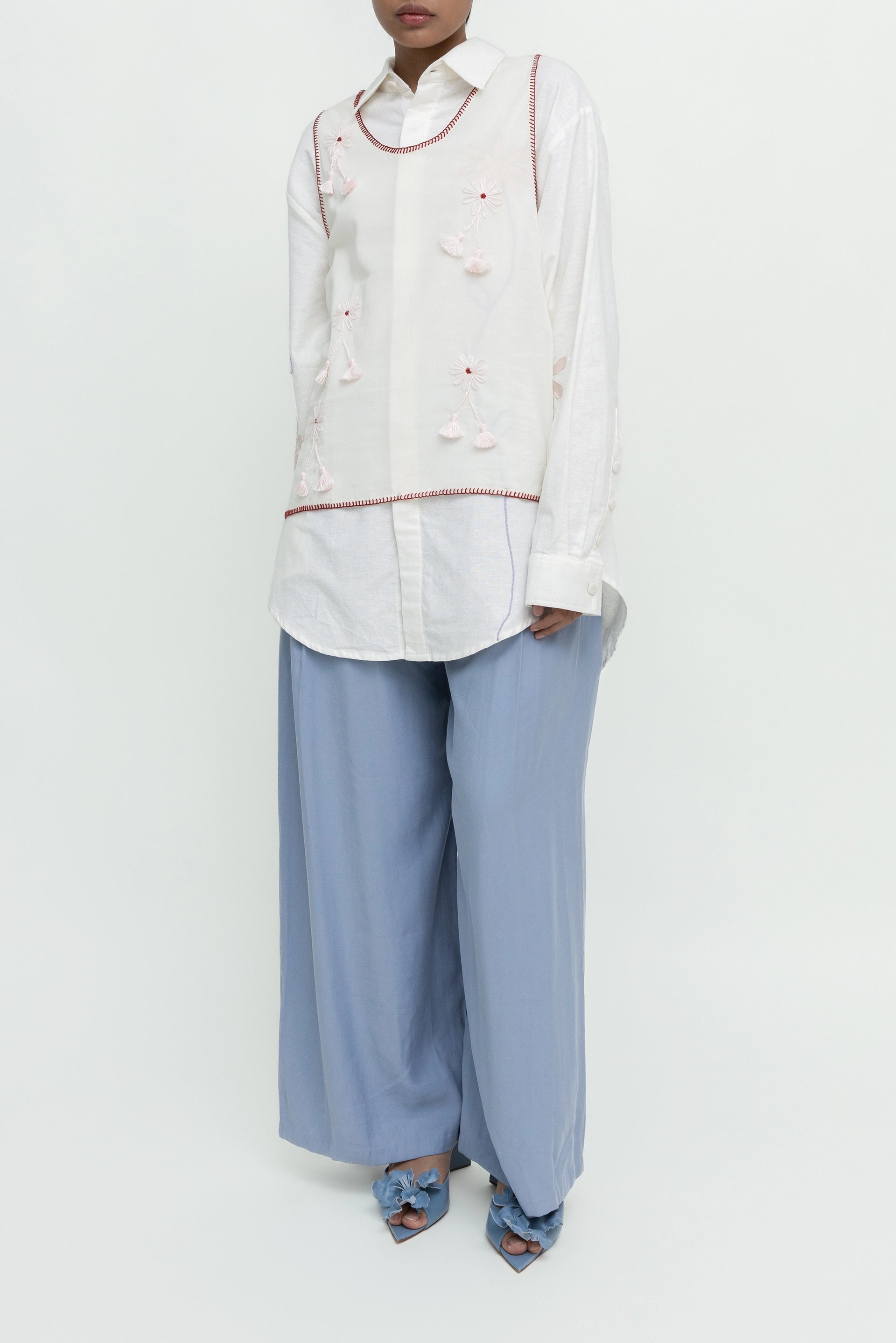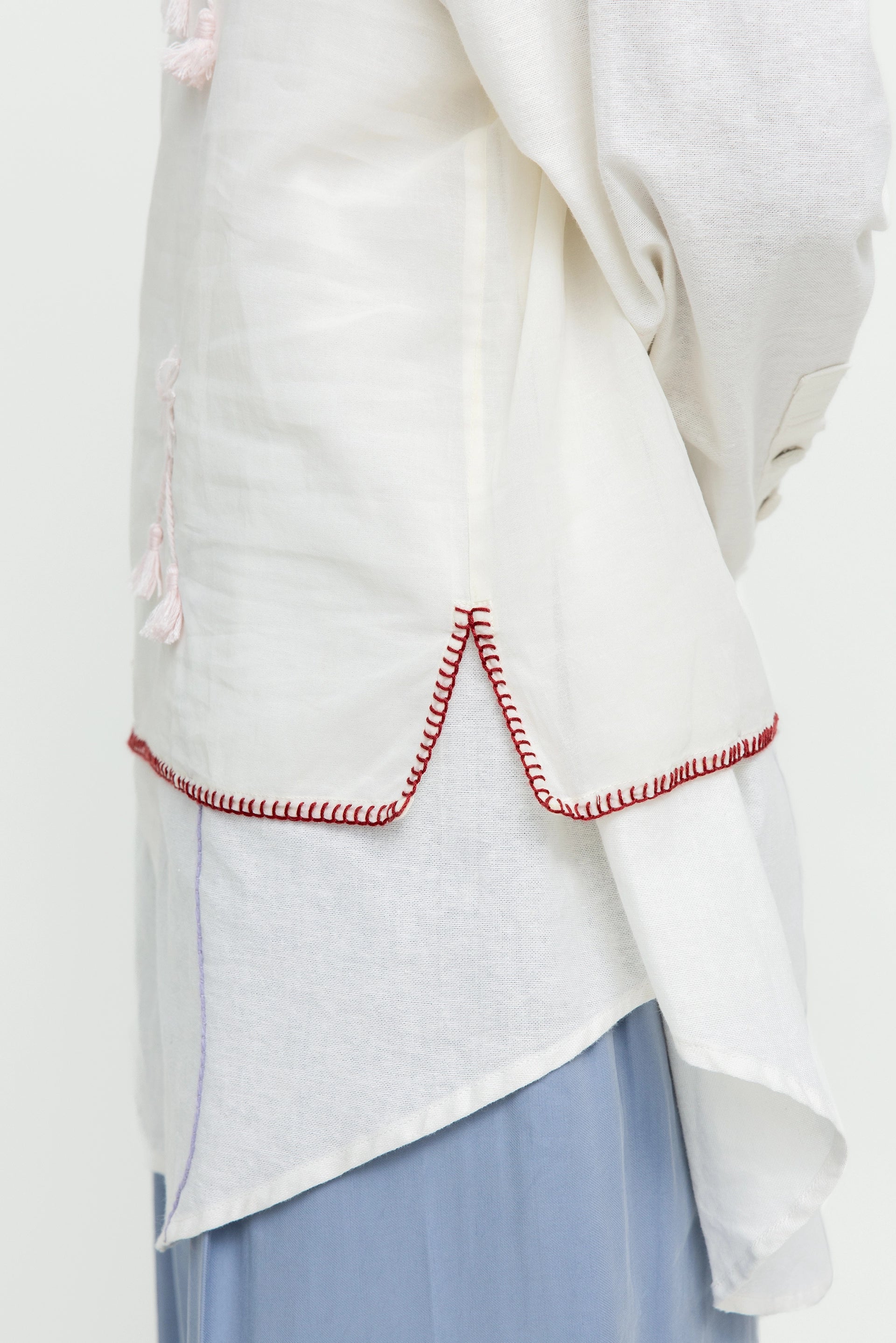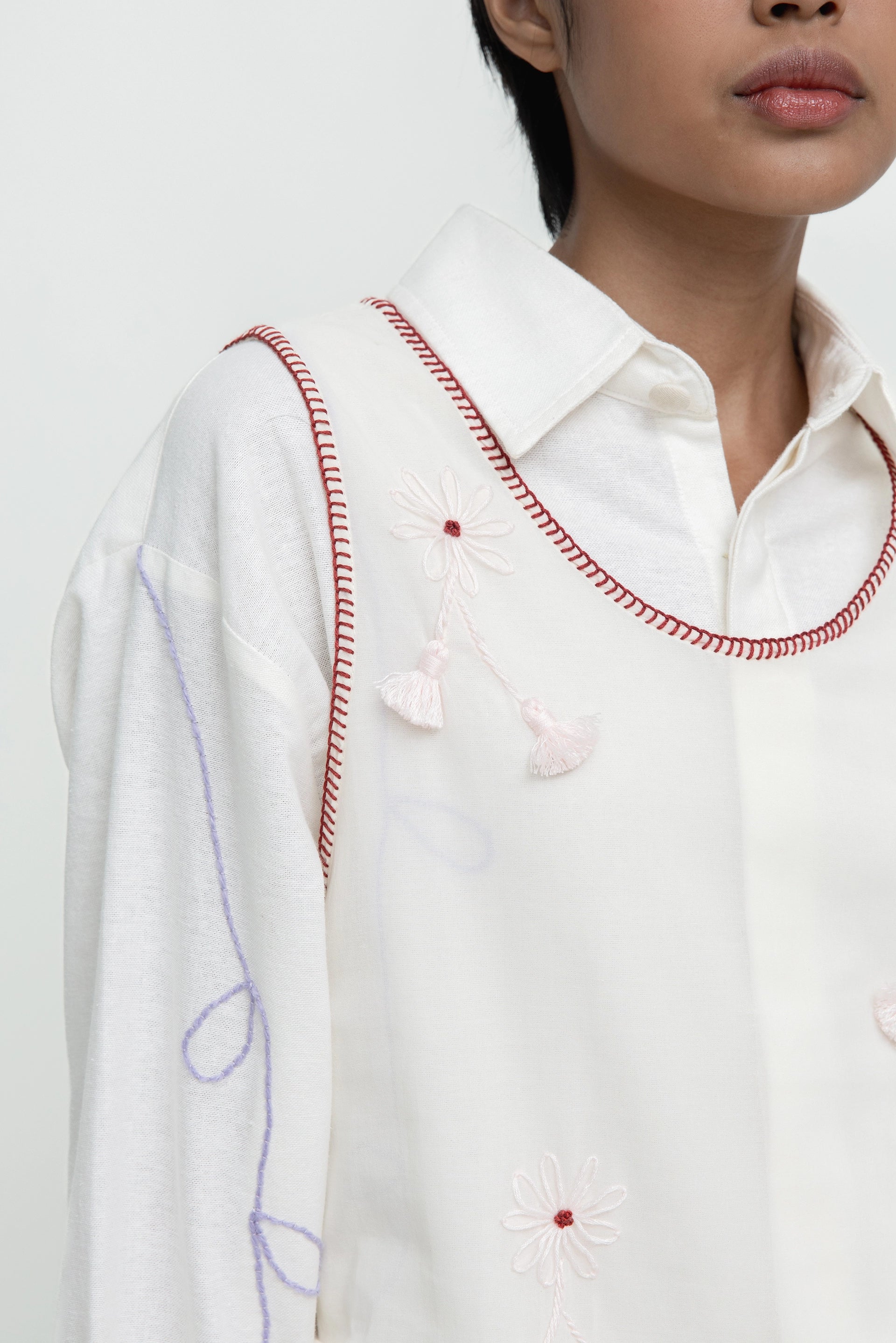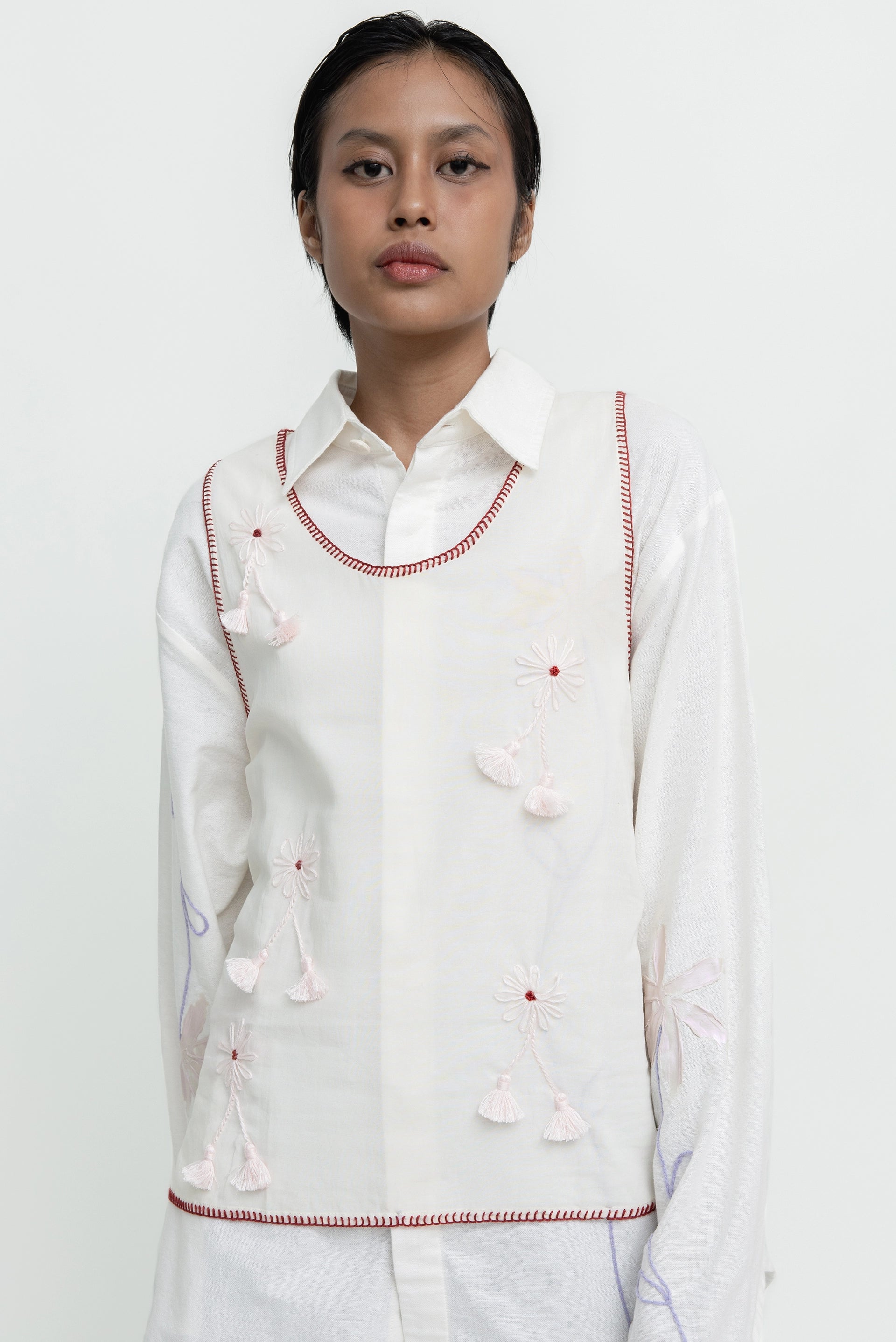 A white sheer tank top adorned with delicate pink floral embroidery and subtle tassel details. Designed to be worn on its own for a soft statement, or layered under shirts and outerwear to add texture and dimension. Lightweight and versatile, this piece transitions effortlessly from day to night styling.