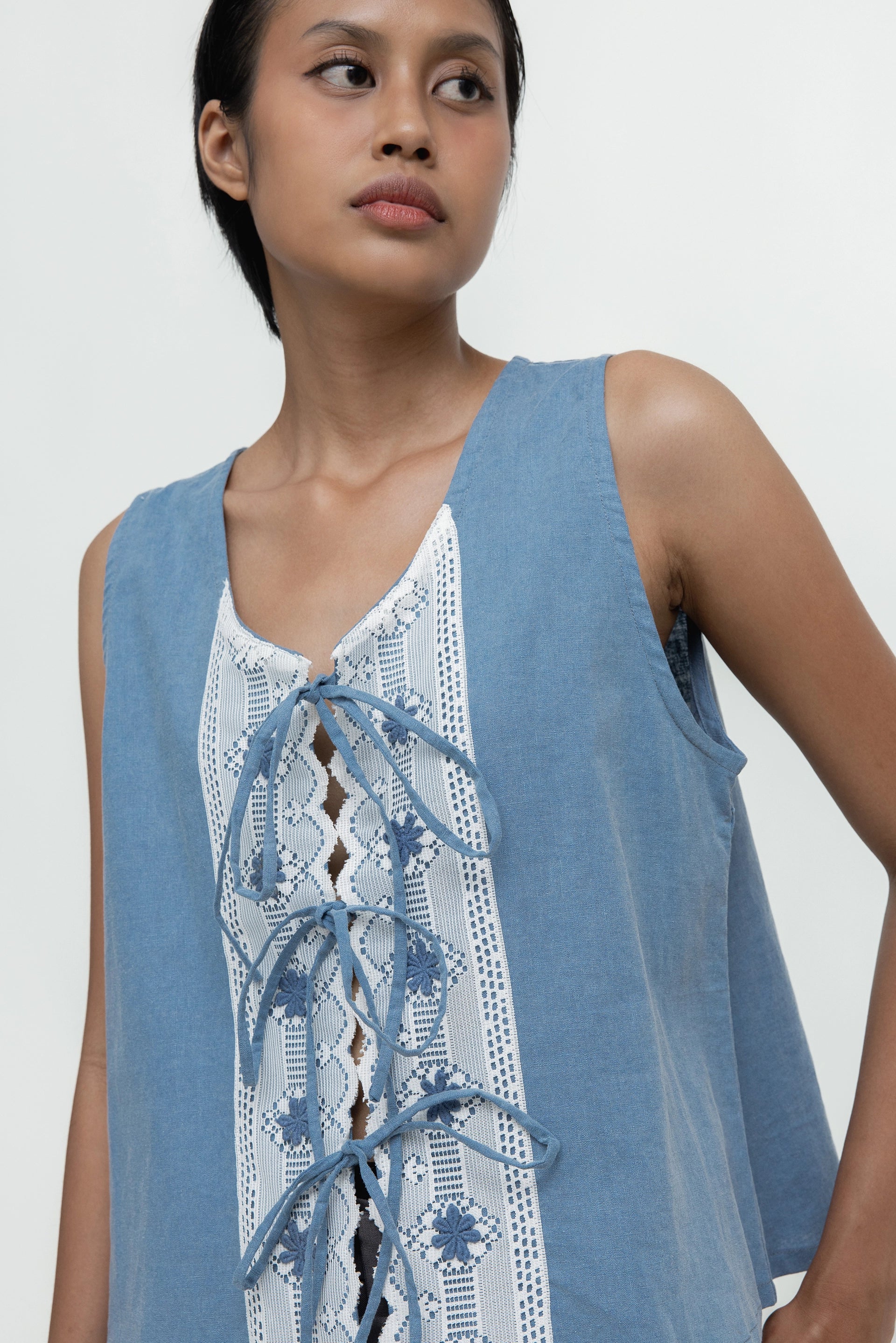 A deep blue vest featuring three front knot closures, adorned with delicate white brocade embellishments and deep blue floral embroidery. Thoughtfully crafted with subtle textures and refined detailing, this piece offers a distinctive statement and can be worn on its own or layered over innerwear for versatile styling