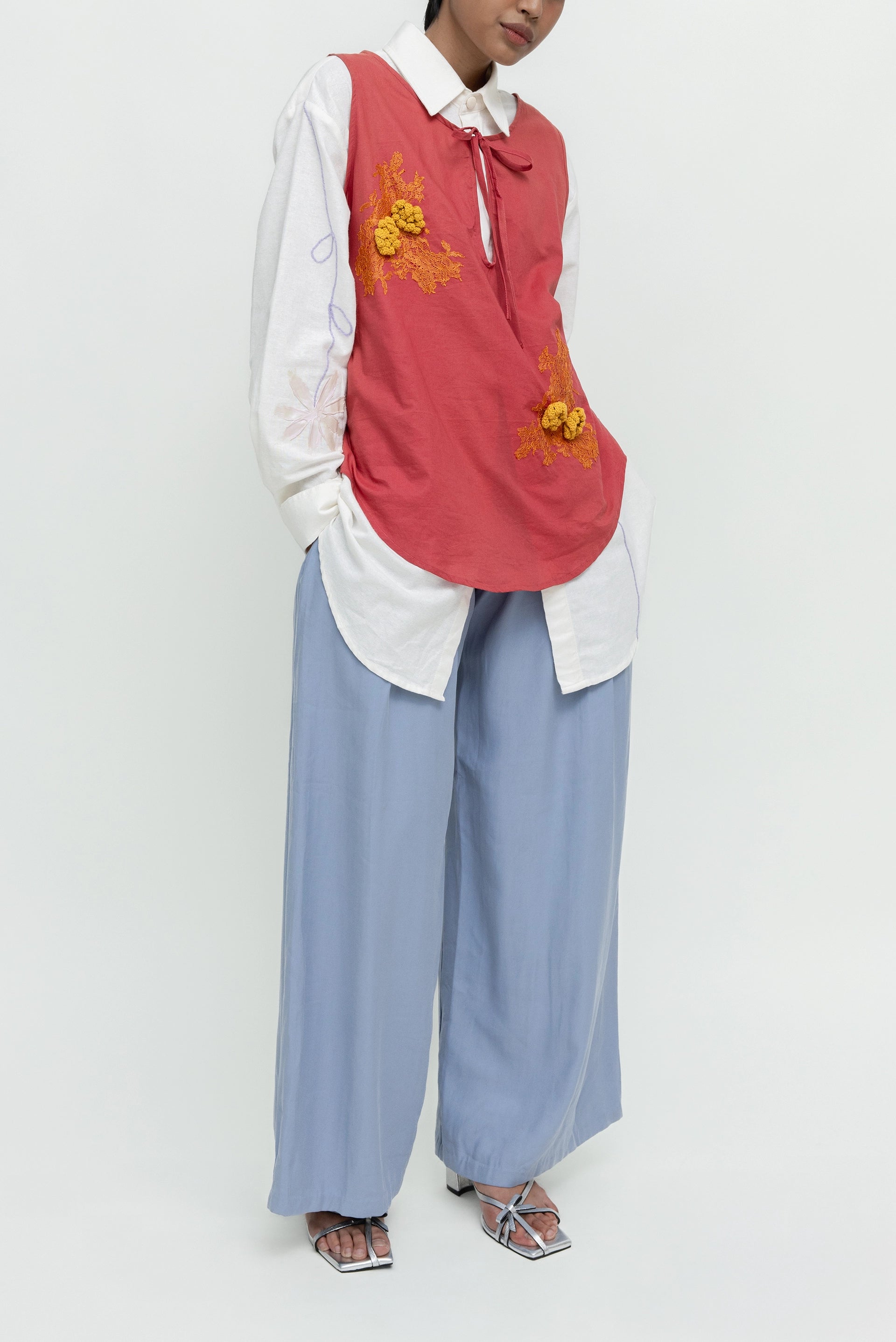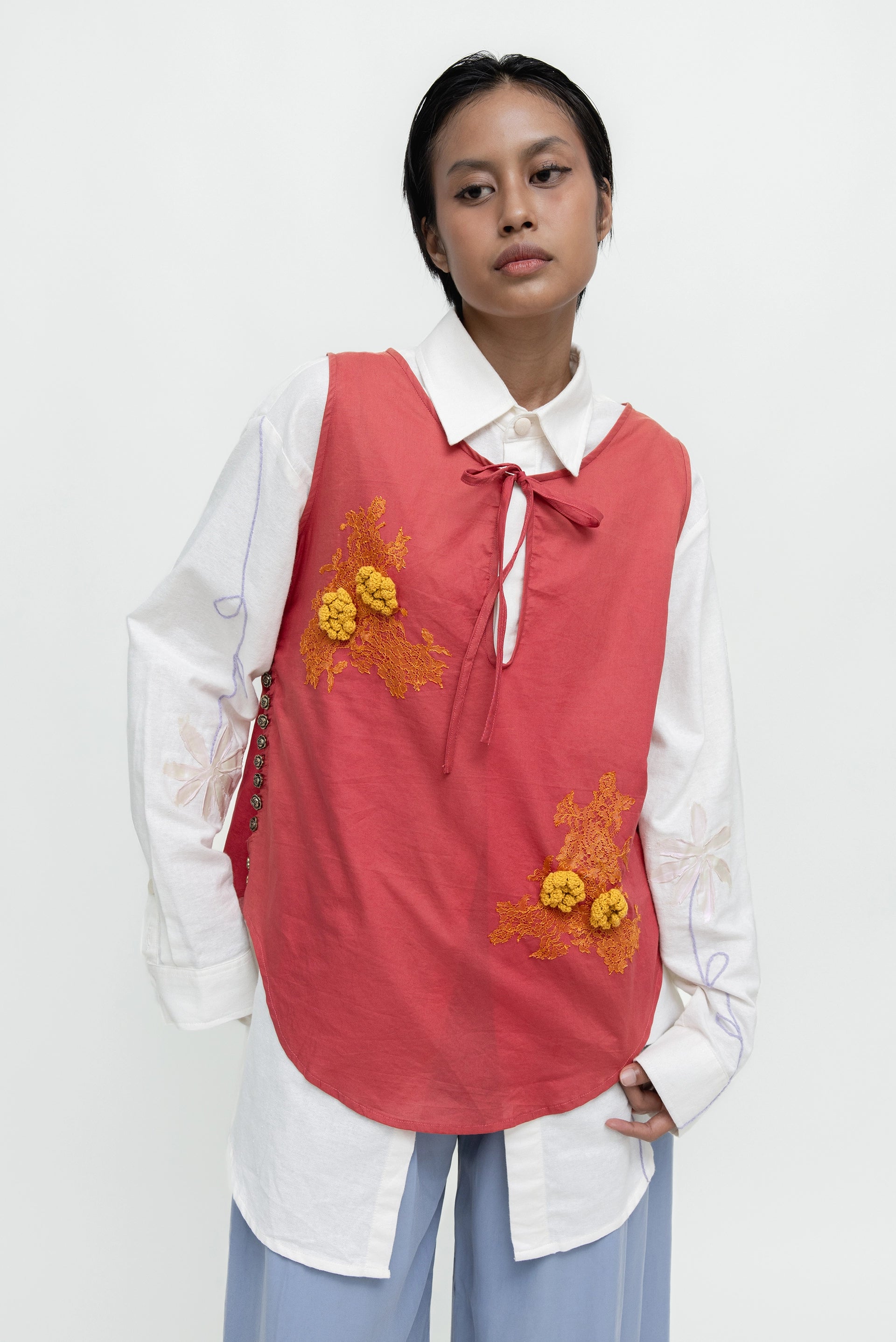 A pink tank top with adjustable front and back ties, featuring gold floral crochet embellishments and delicate gold brocade details. Designed to be worn on its own for a bold yet refined look, or layered under shirts and outerwear to add texture and depth. Lightweight and versatile, this piece makes an effortless statement from day to night.