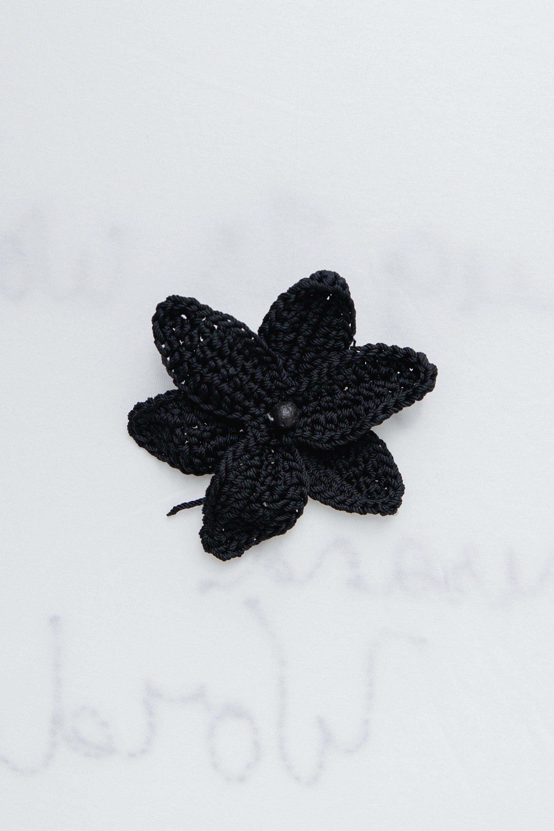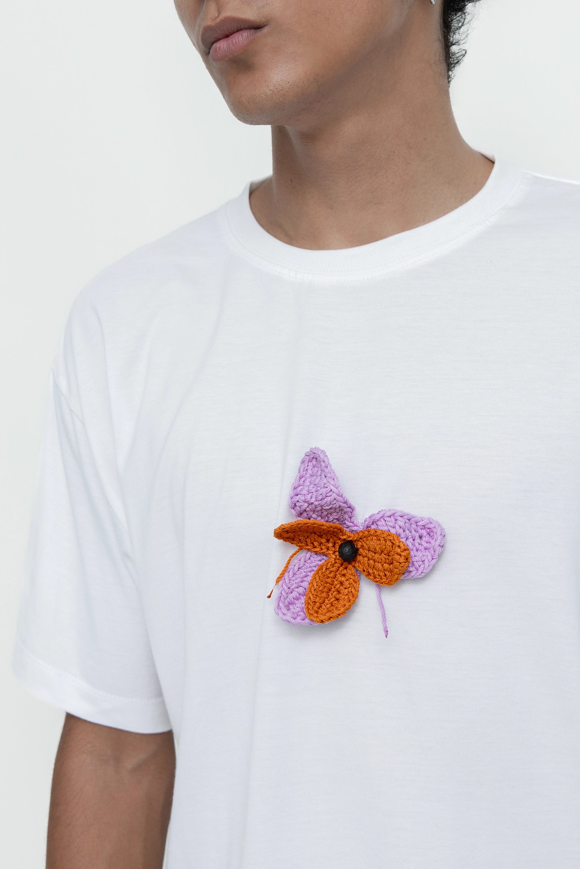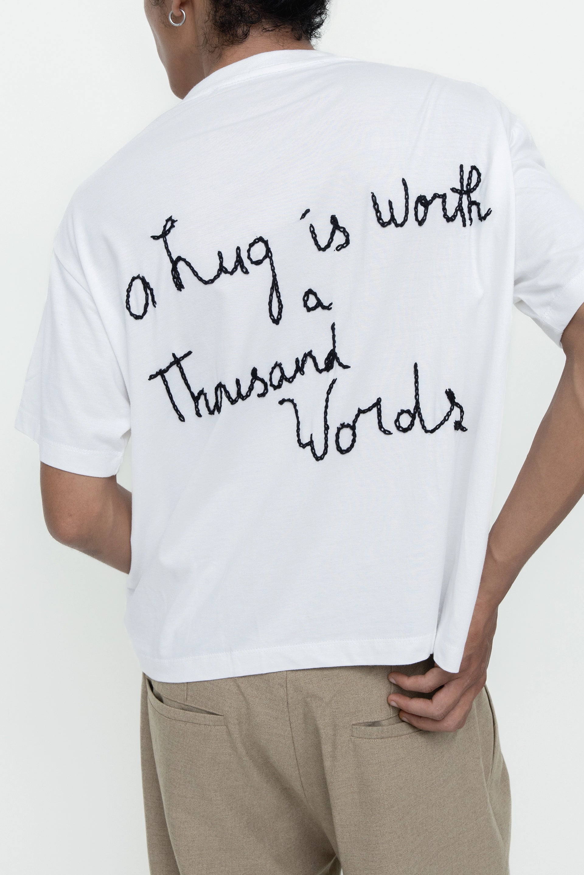 T-shirt collaboration with Rama Dauhan with hand embroidery, "a hug is worth a thousand words" wording on the back, and unique flowers on the front. The model is cropped fit.
