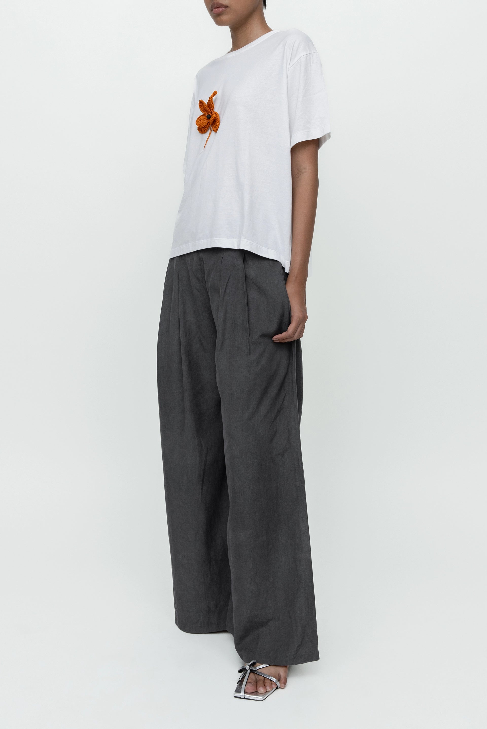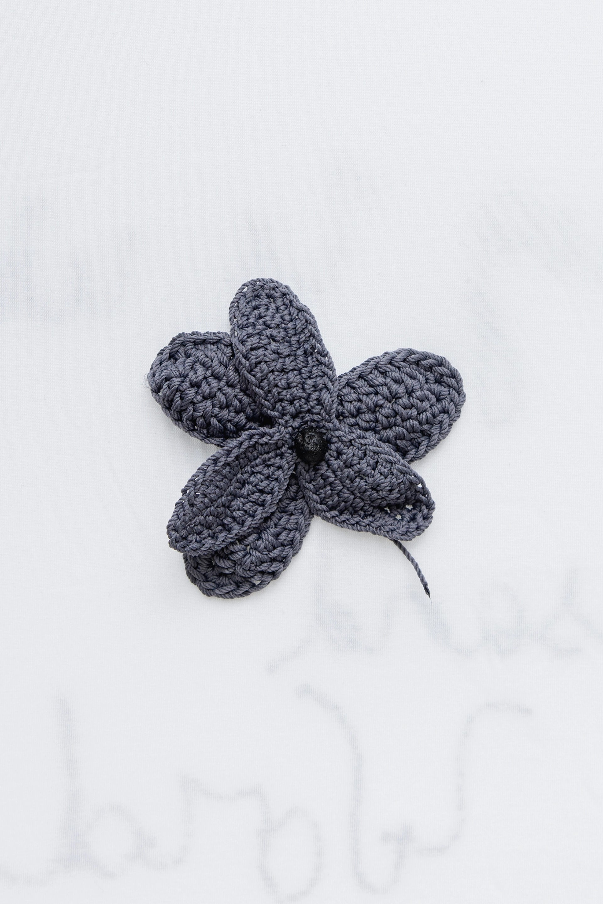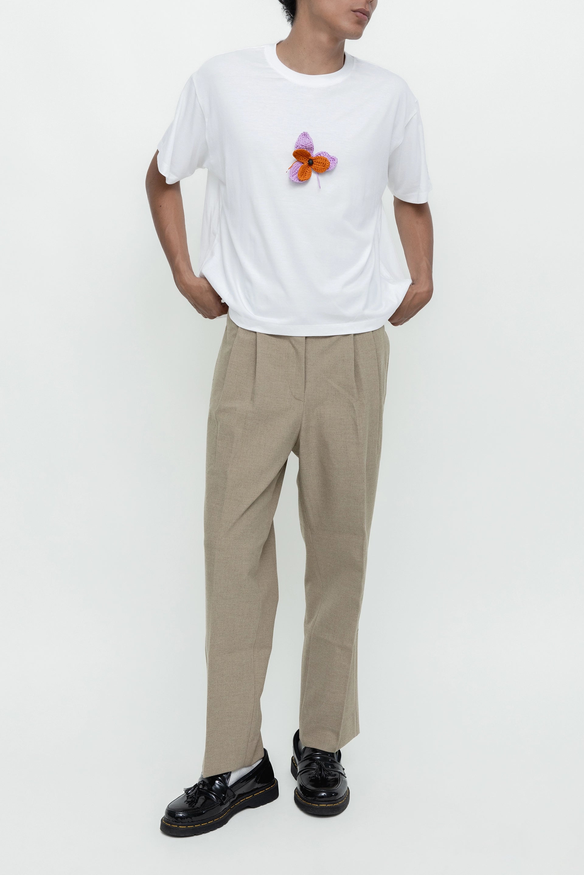 T-shirt collaboration with Rama Dauhan with hand embroidery, "a hug is worth a thousand words" wording on the back, and unique flowers on the front. The model is cropped fit.