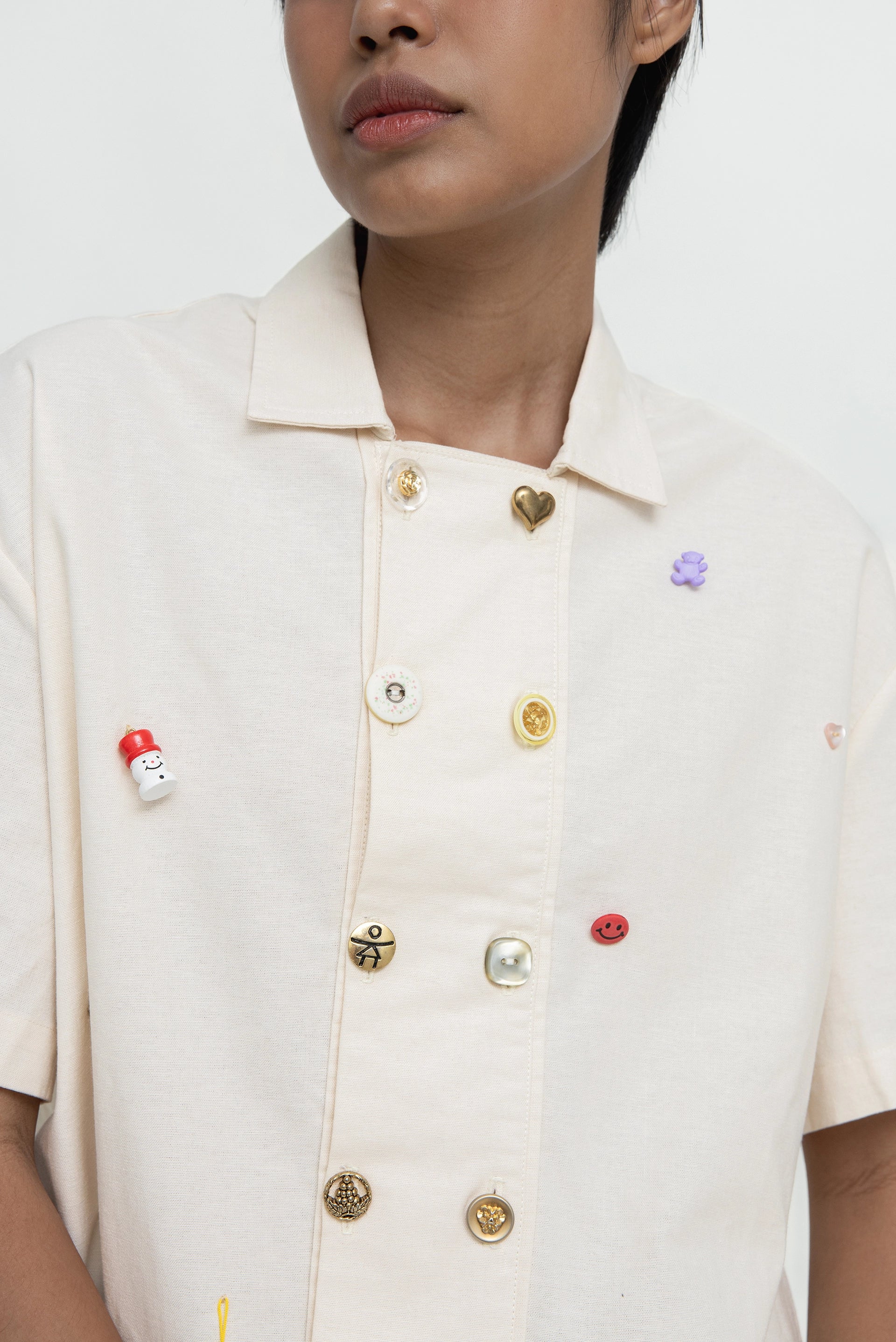 An off-white short-sleeved shirt featuring a double-breasted opening, adorned with an eclectic selection of trinket buttons collected by the designer across Europe. Additional trinket details enhance its character, making each piece feel unique and one of a kind. Designed with a boxy cut to create a structured silhouette, this shirt balances statement detailing with a modern shape.